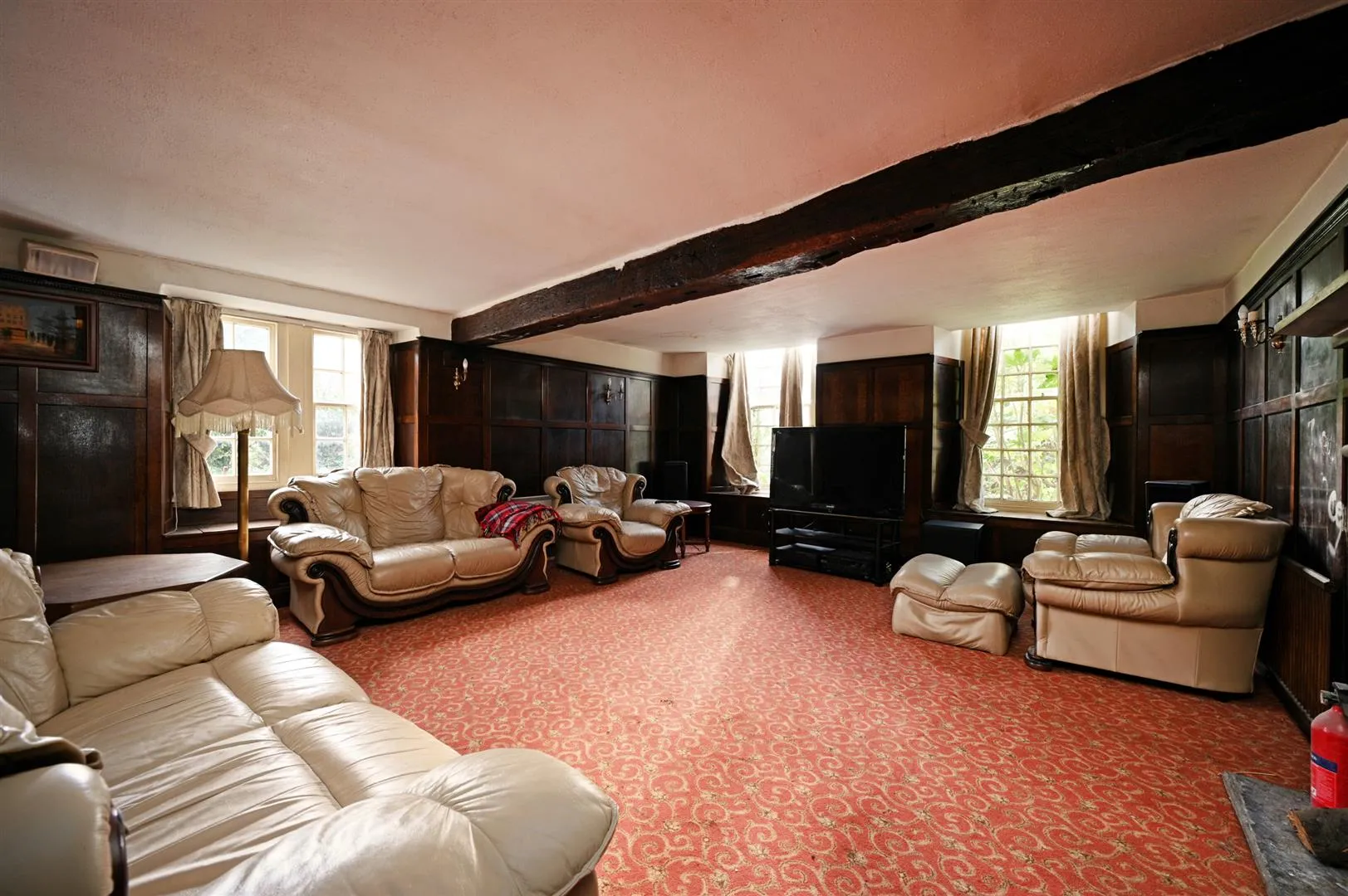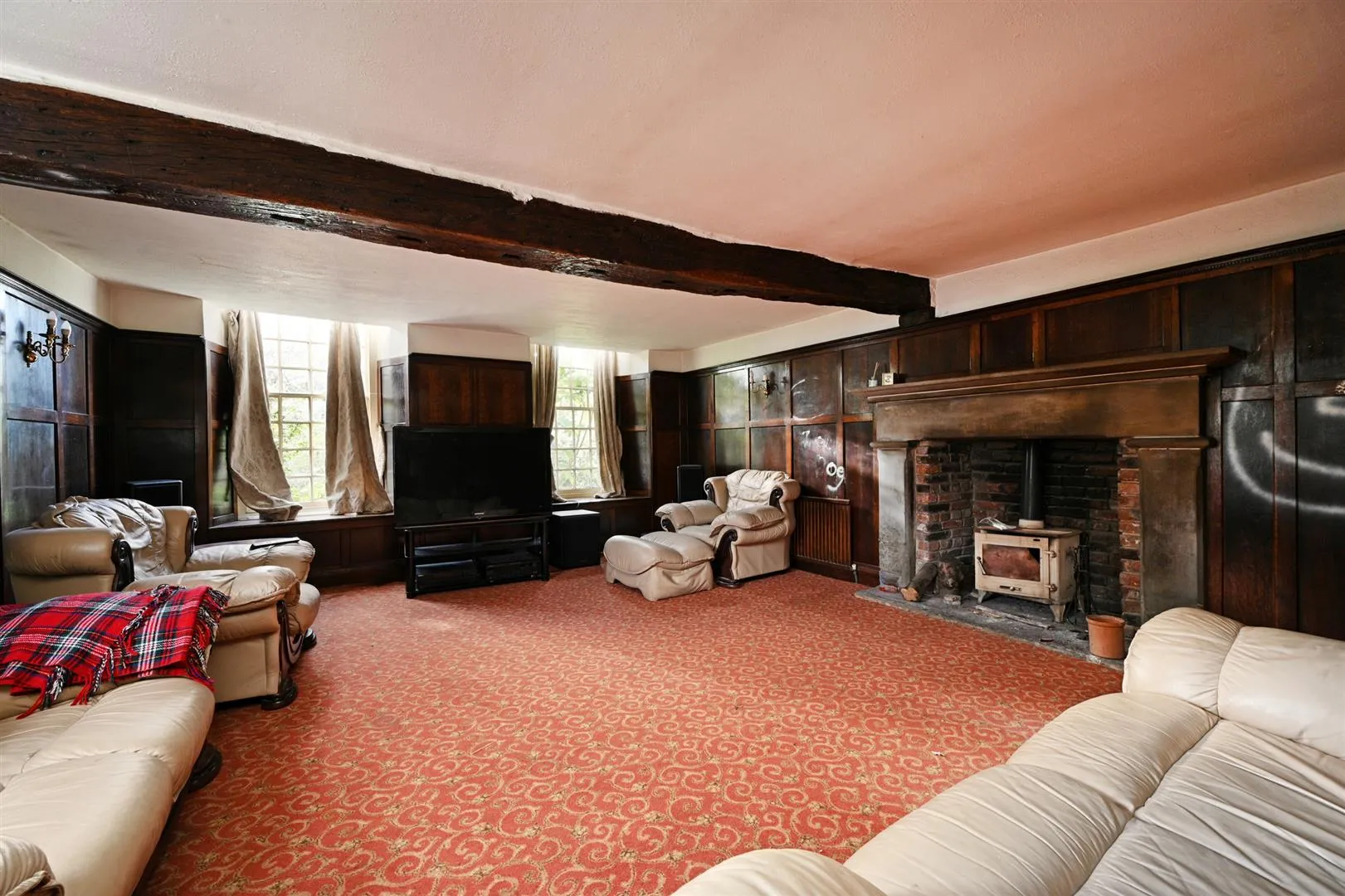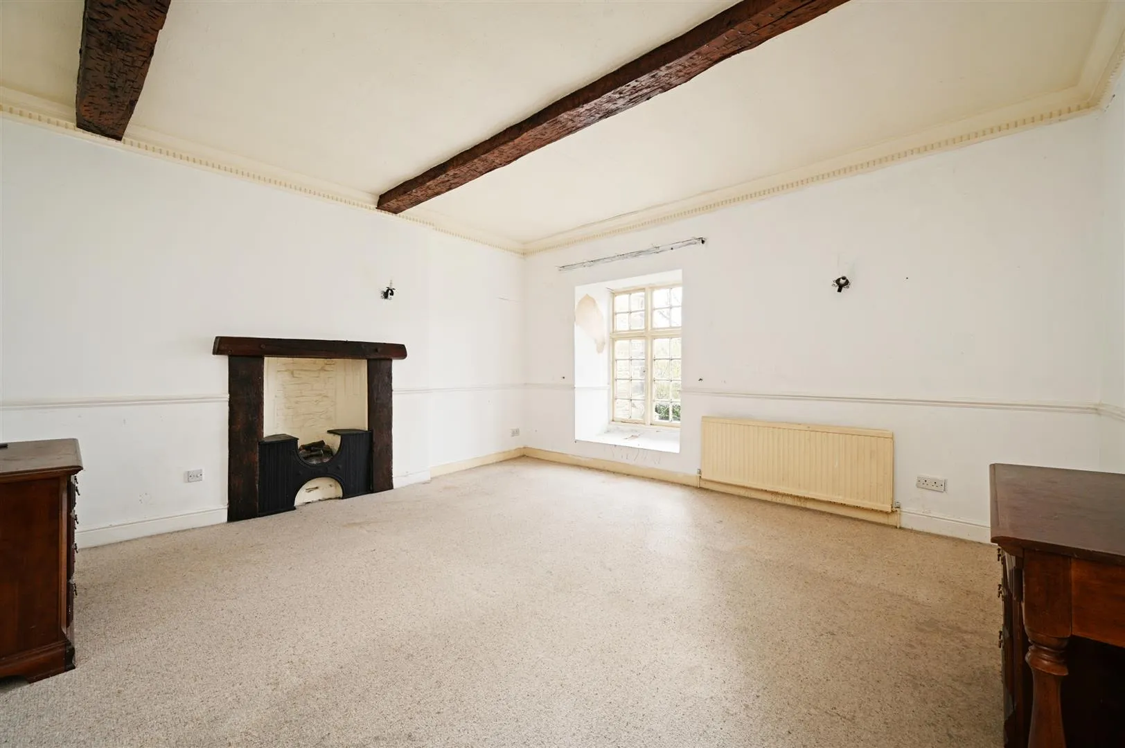 A large lounge with side and front facing timber glazed windows, an exposed timber beam, wall mounted light points, central heating radiators and a TV/aerial point. The focal point of the room is the original fireplace with a stone surround, mantel and hearth.