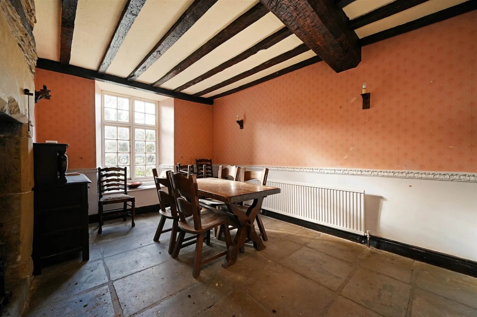 With a front facing timber glazed window, wall mounted light points, central heating radiator and stone tiled flooring. The focal point of the room is the original stone fireplace with a surround, mantel and hearth.