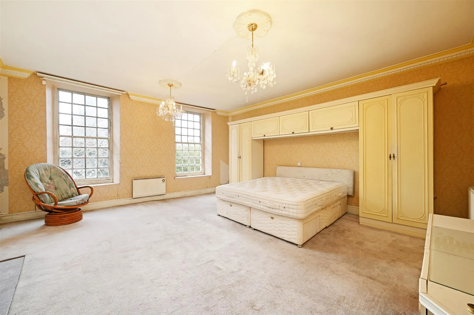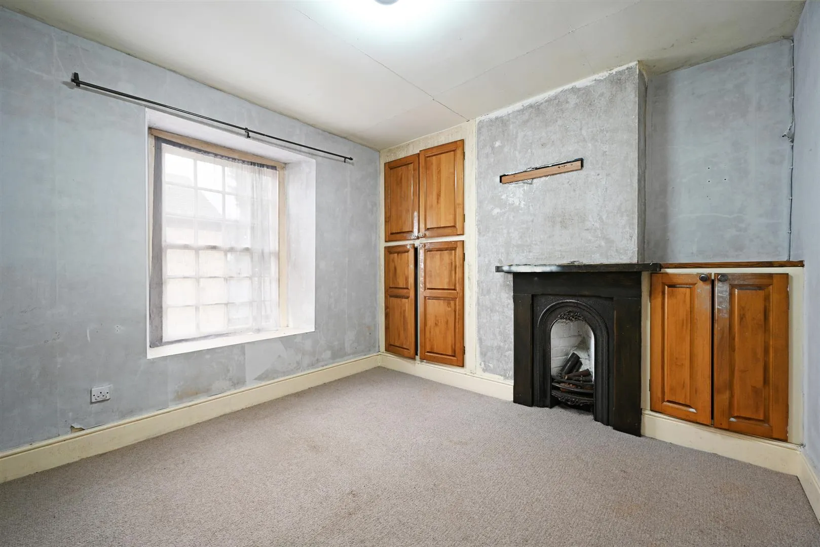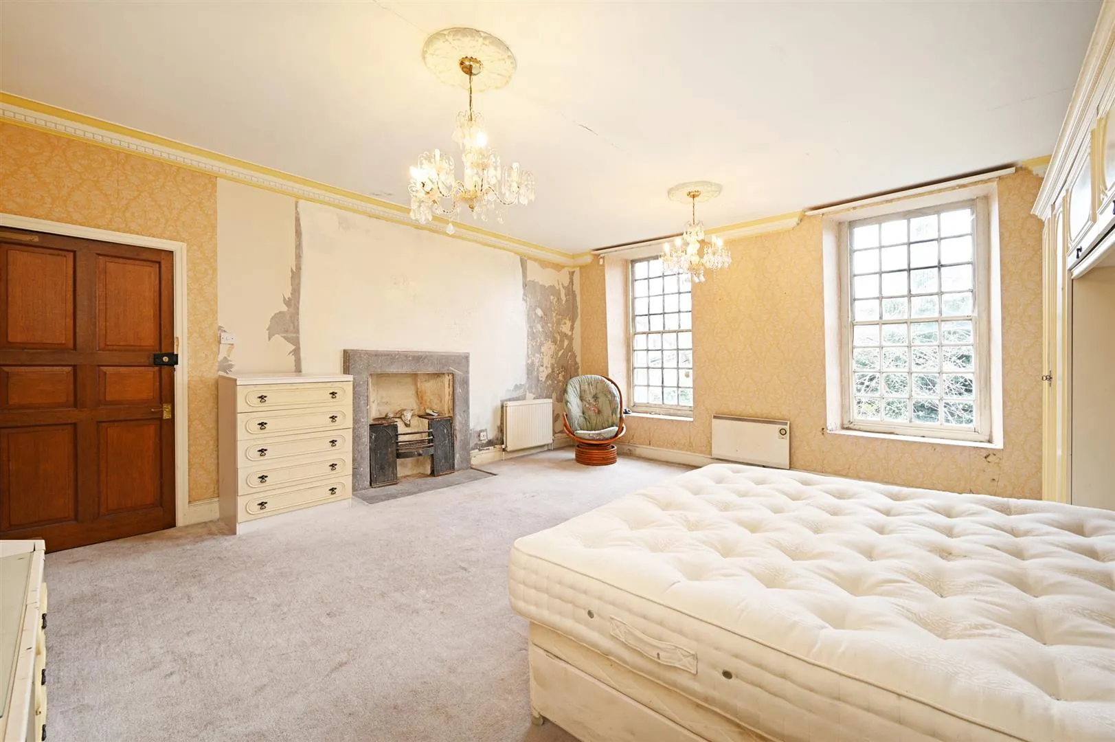 Another double bedroom with side facing timber glazed sash windows, coved ceiling, pendant light points with decorative ceiling roses and central heating radiators. The focal point of the room is the stone fireplace.