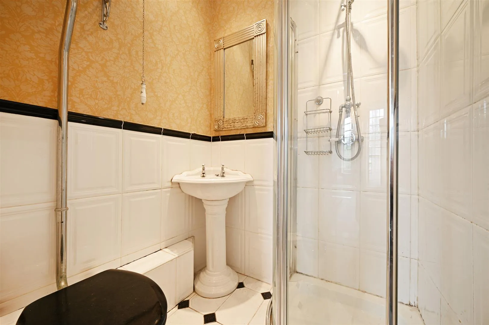 Having recessed lighting, partially tiled walls and tiled flooring. A suite comprises a low-level WC and a pedestal wash hand basin with traditional chrome taps. To one corner is a separate shower enclosure with a fitted shower and a glazed screen/door.