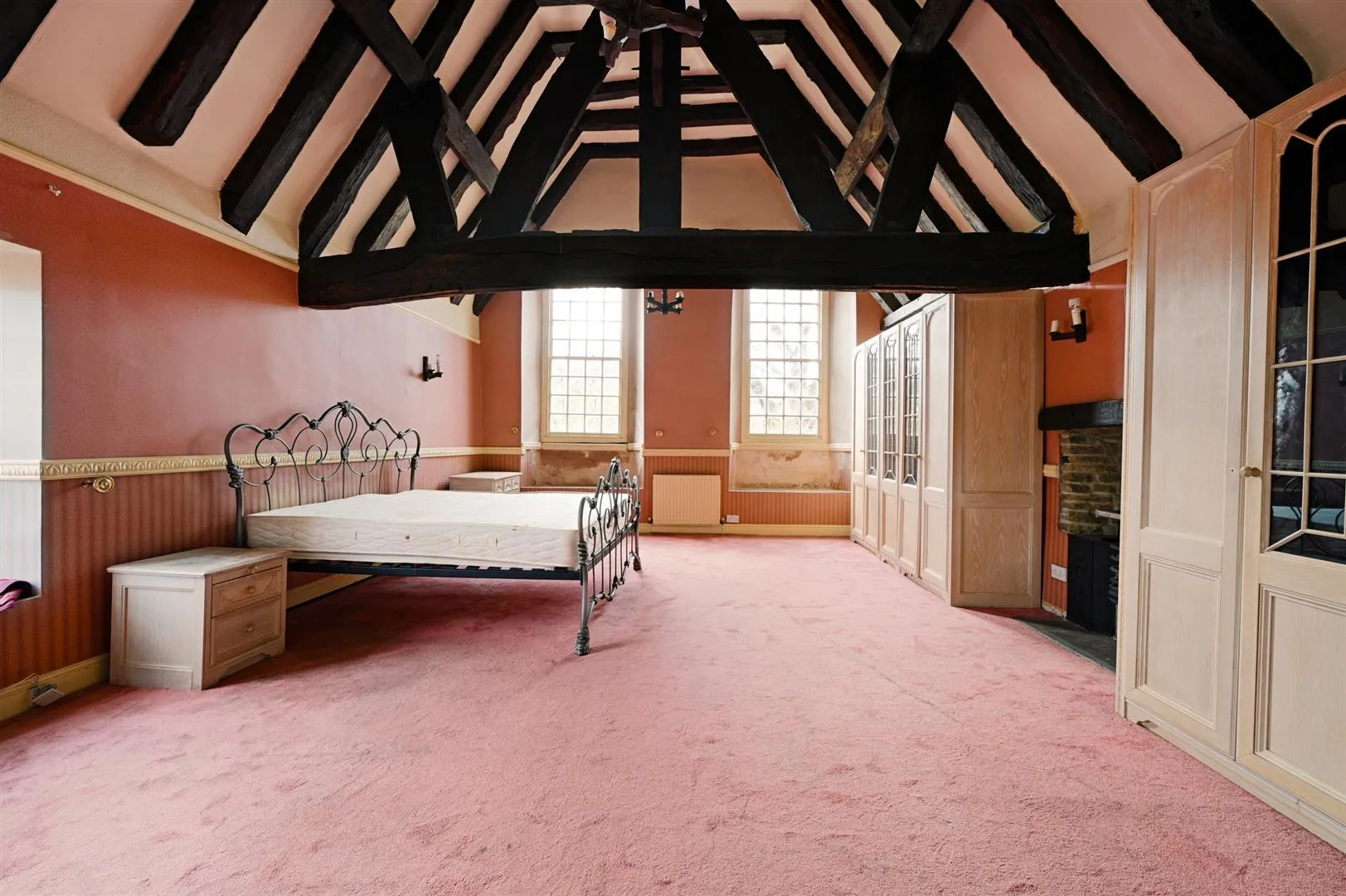 A further double bedroom with a front facing timber glazed window, exposed timber beams, wall mounted light points and a central heating radiator. The focal point of the room is the original fireplace with a timber surround.