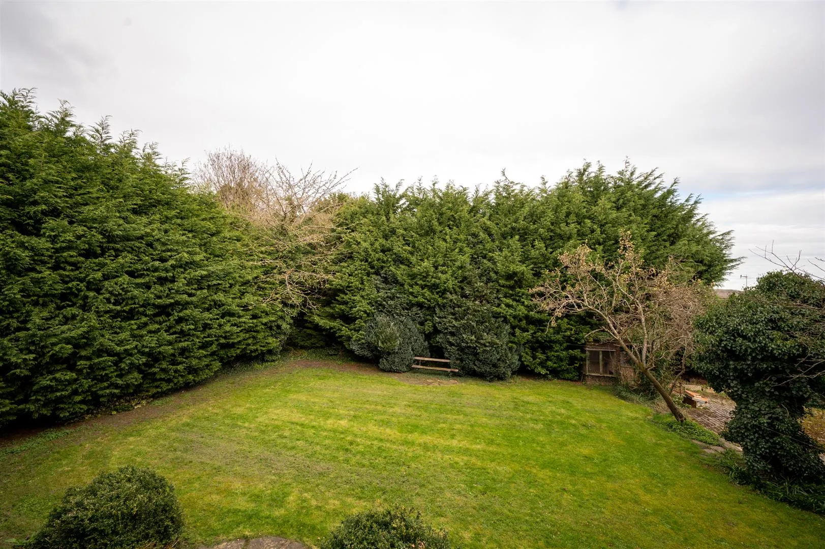 The rear is enclosed by mature hedging.