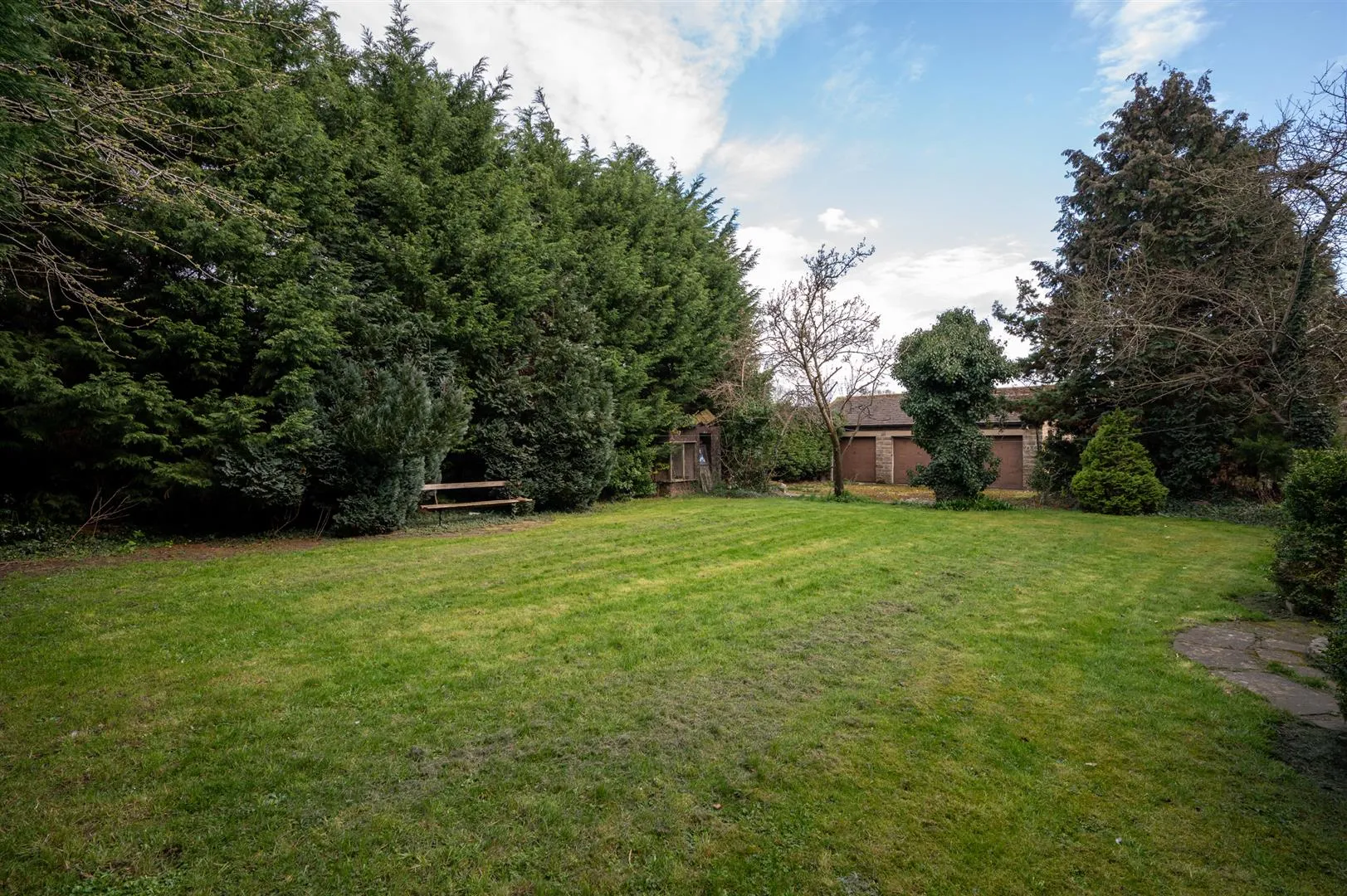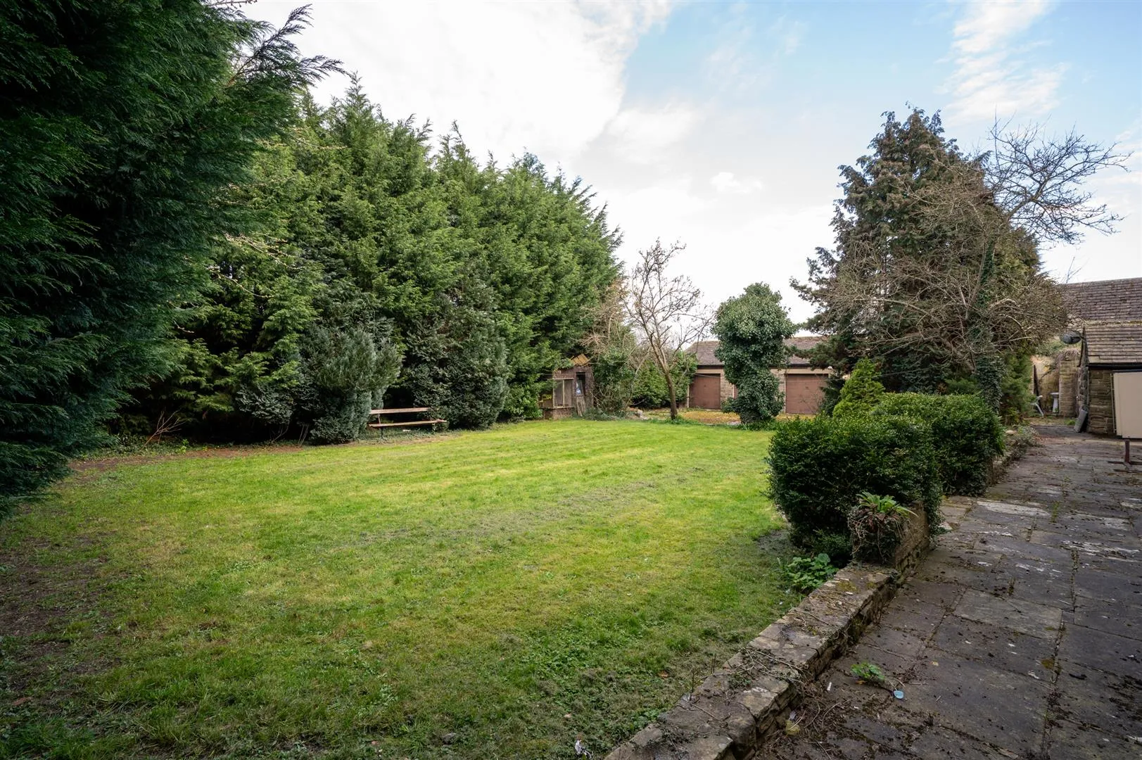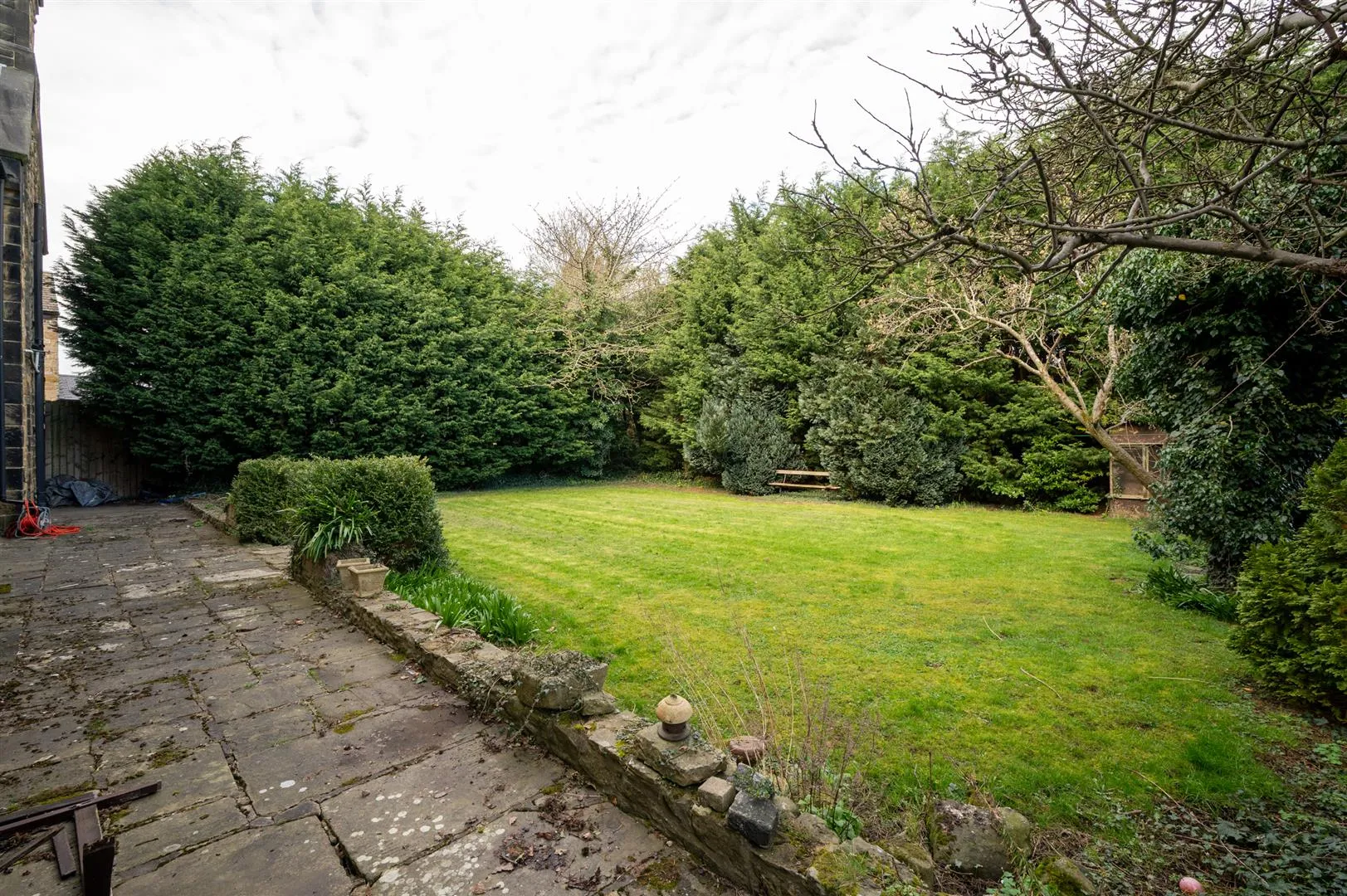 A timber gate opens to the rear of the property, where there is a large stone flagged patio. Beyond the patio is a garden mainly laid to lawn with a variety of plants and mature trees.