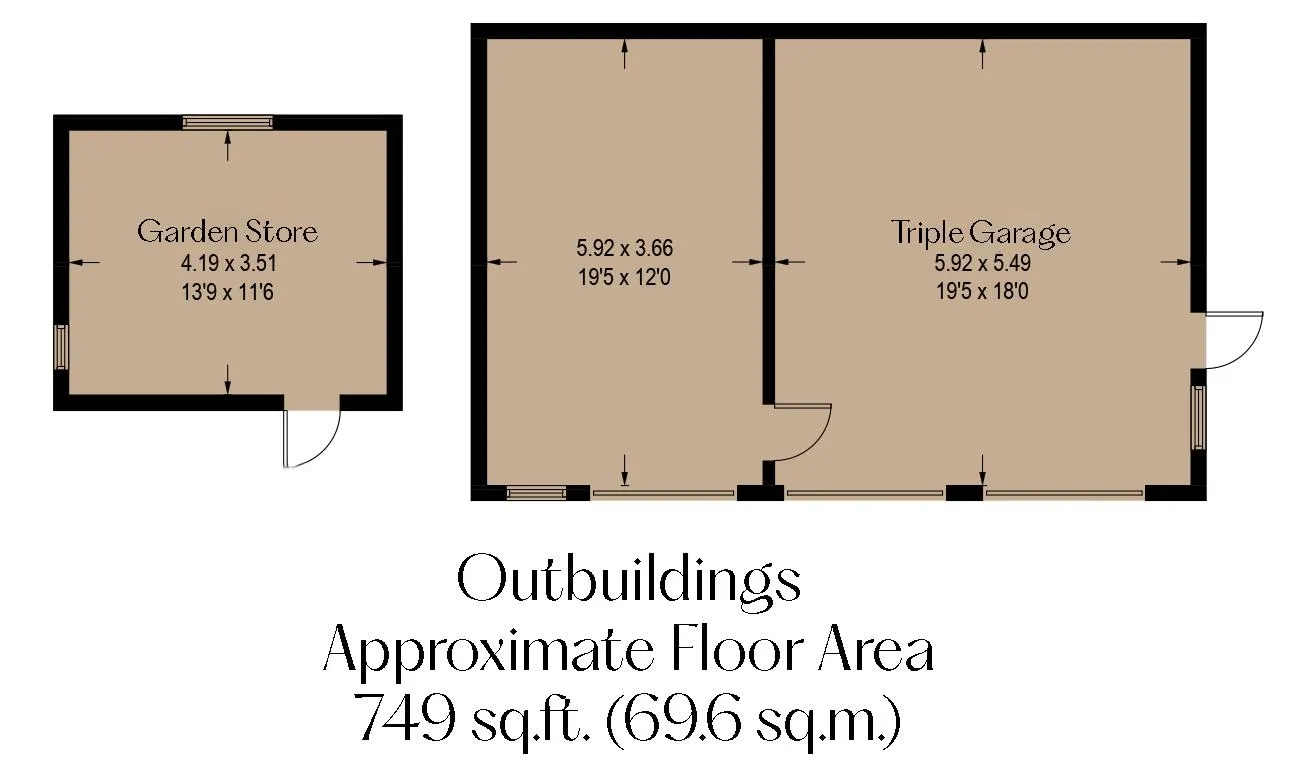 Outbuildings: Store and triple garage.
