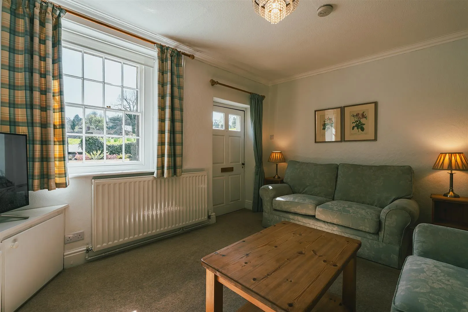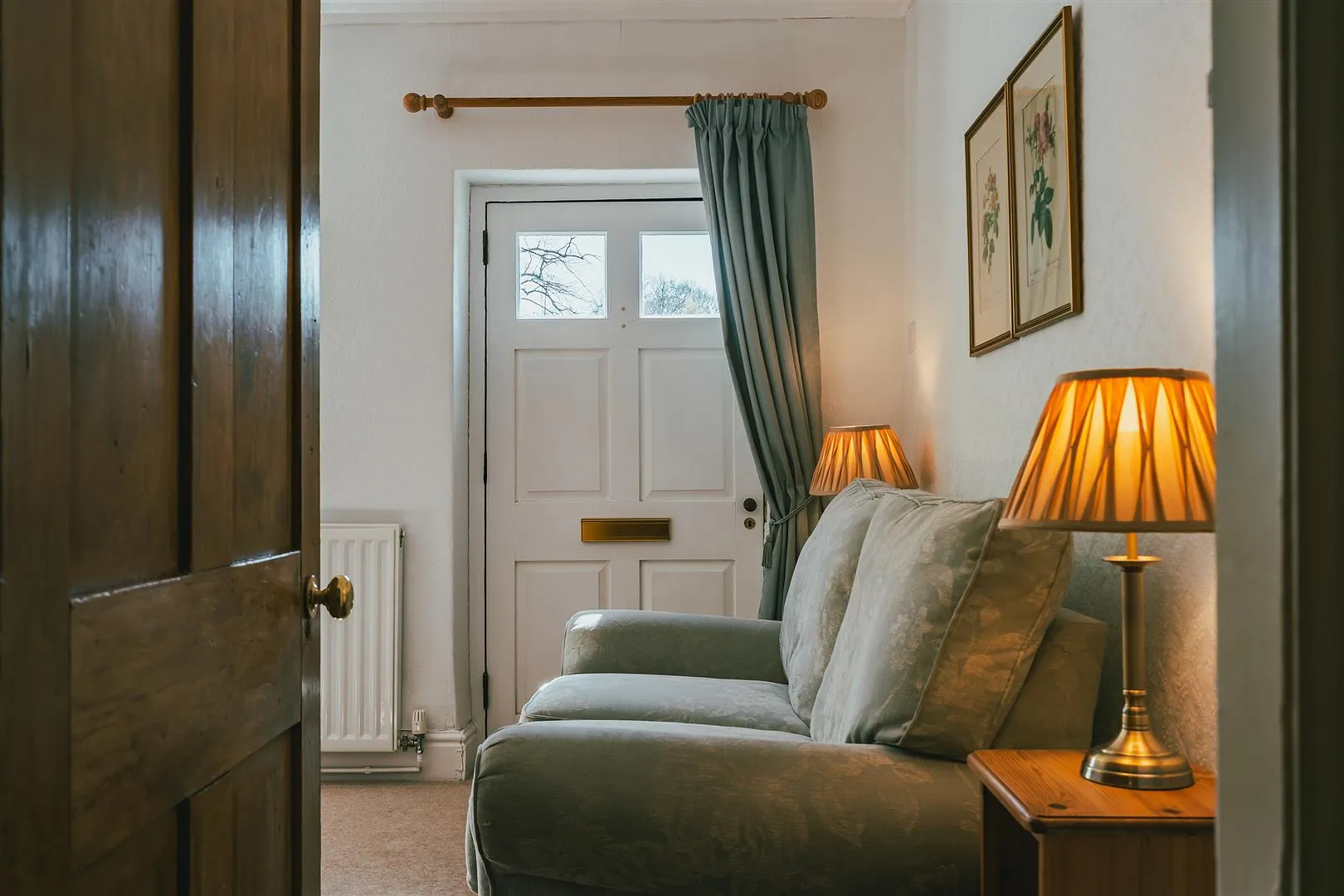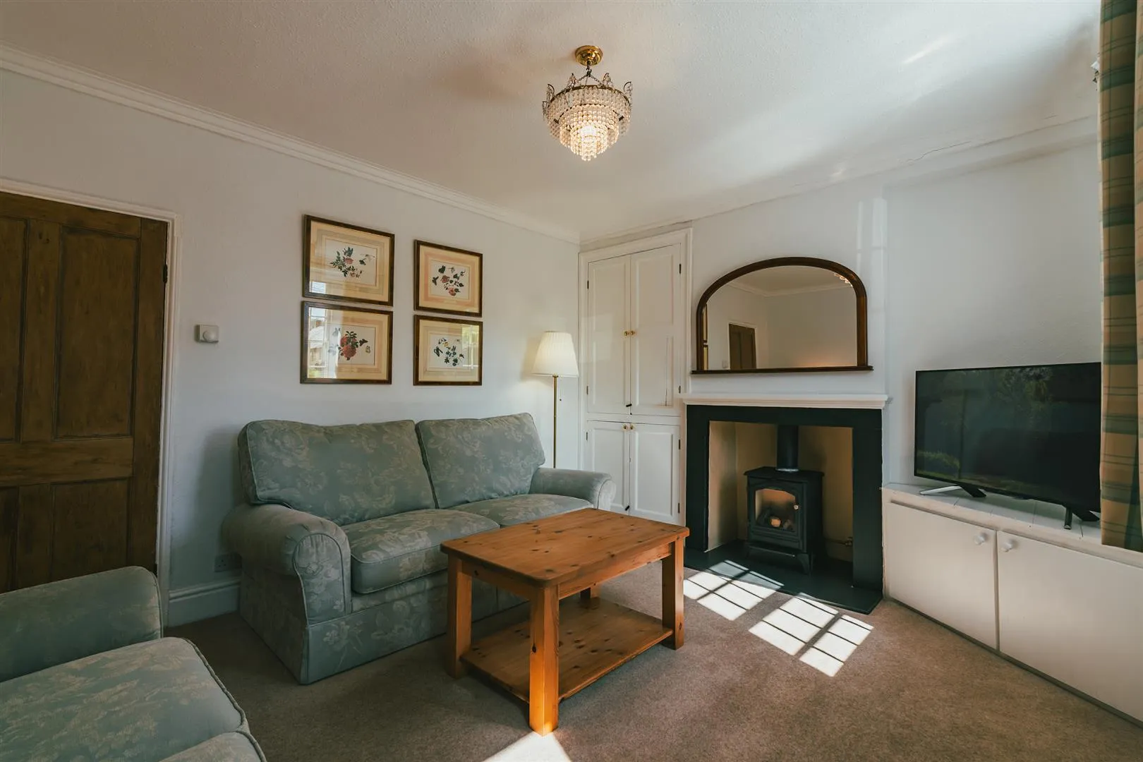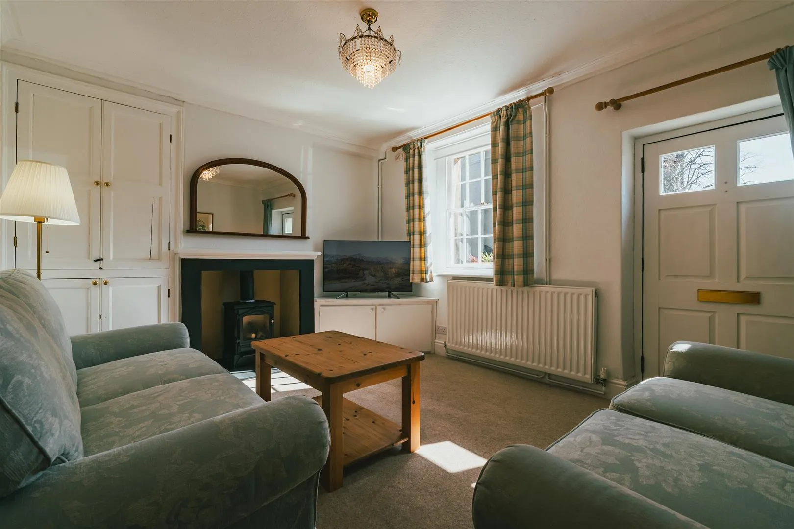 A south-facing lounge with a front facing timber glazed window, coved ceiling, pendant light point, central heating radiator and a TV/aerial point. The focal point of the room is the cast-iron stove with a surround, mantel and slate hearth. Fitted furniture includes an original built-in alcove cupboard. A timber door opens to the front of the property.
