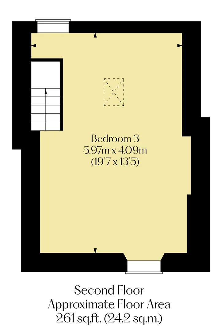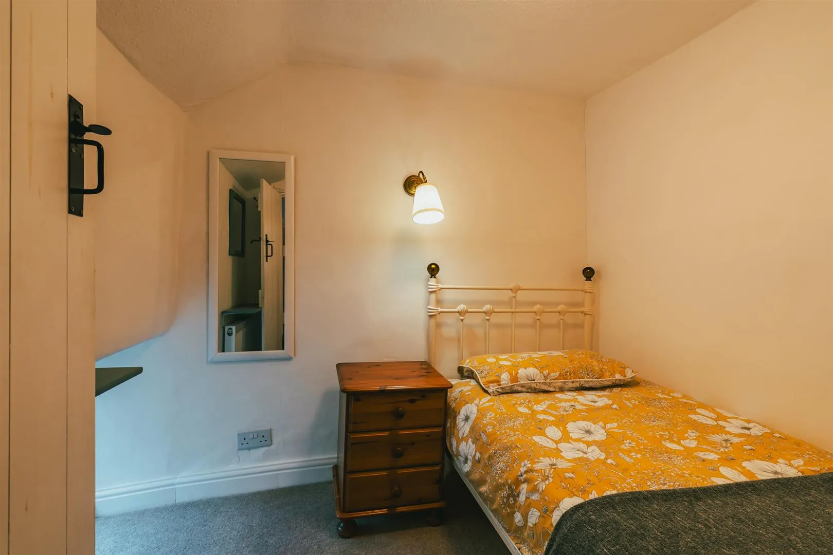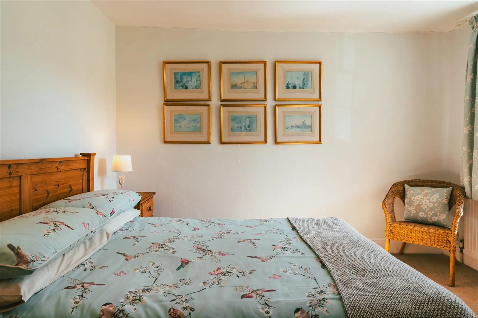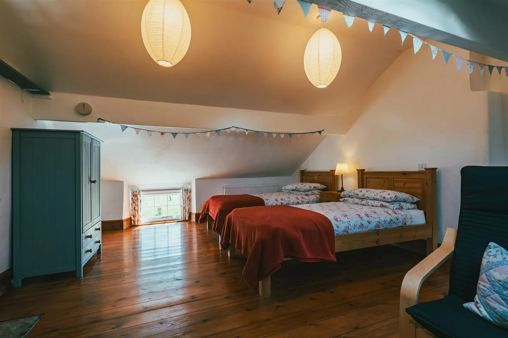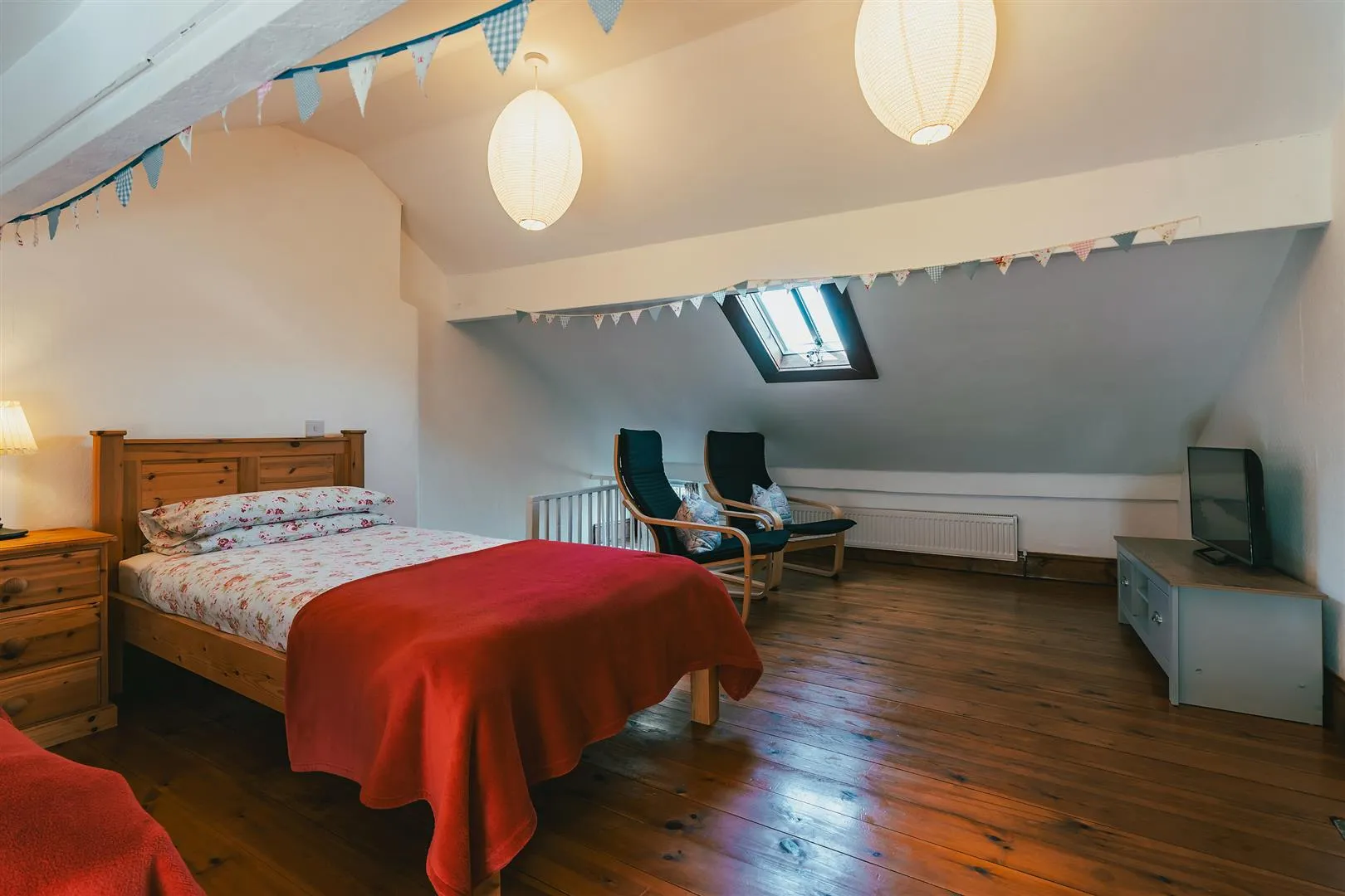 A large, airy double bedroom with a roof window, front and rear facing timber glazed windows, pendant light points, central heating radiators, TV/aerial point and pine flooring. The focal point of the room is the fireplace with a stone surround and hearth.