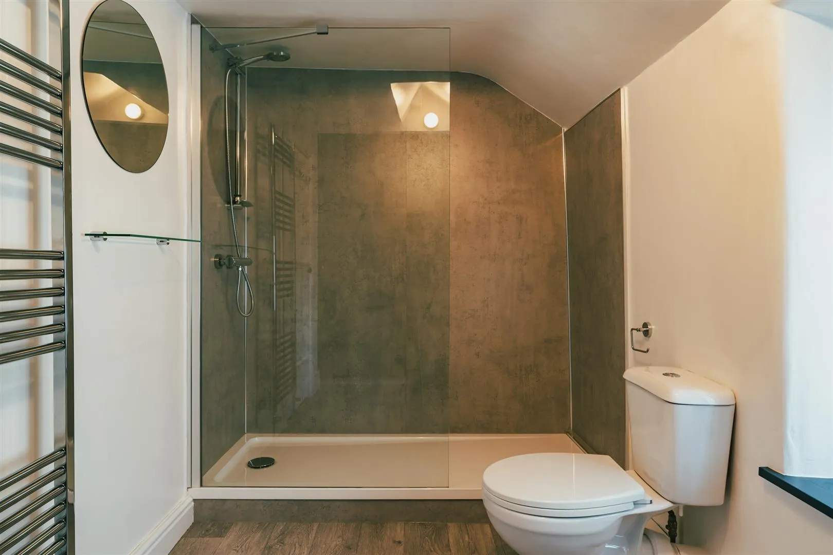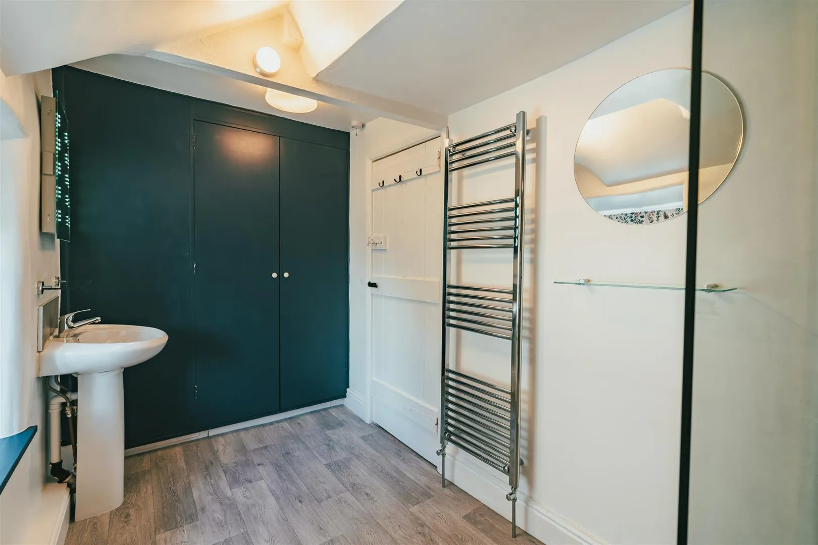 A modern shower room with a side facing timber glazed window, flush light points and a chrome heated towel rail. Fitted furniture includes shelving and a cupboard houses the boiler. A suite in white comprises a low-level WC and a pedestal wash hand basin with a chrome mixer tap. To one wall is a separate shower enclosure with a fitted shower and a glazed screen.