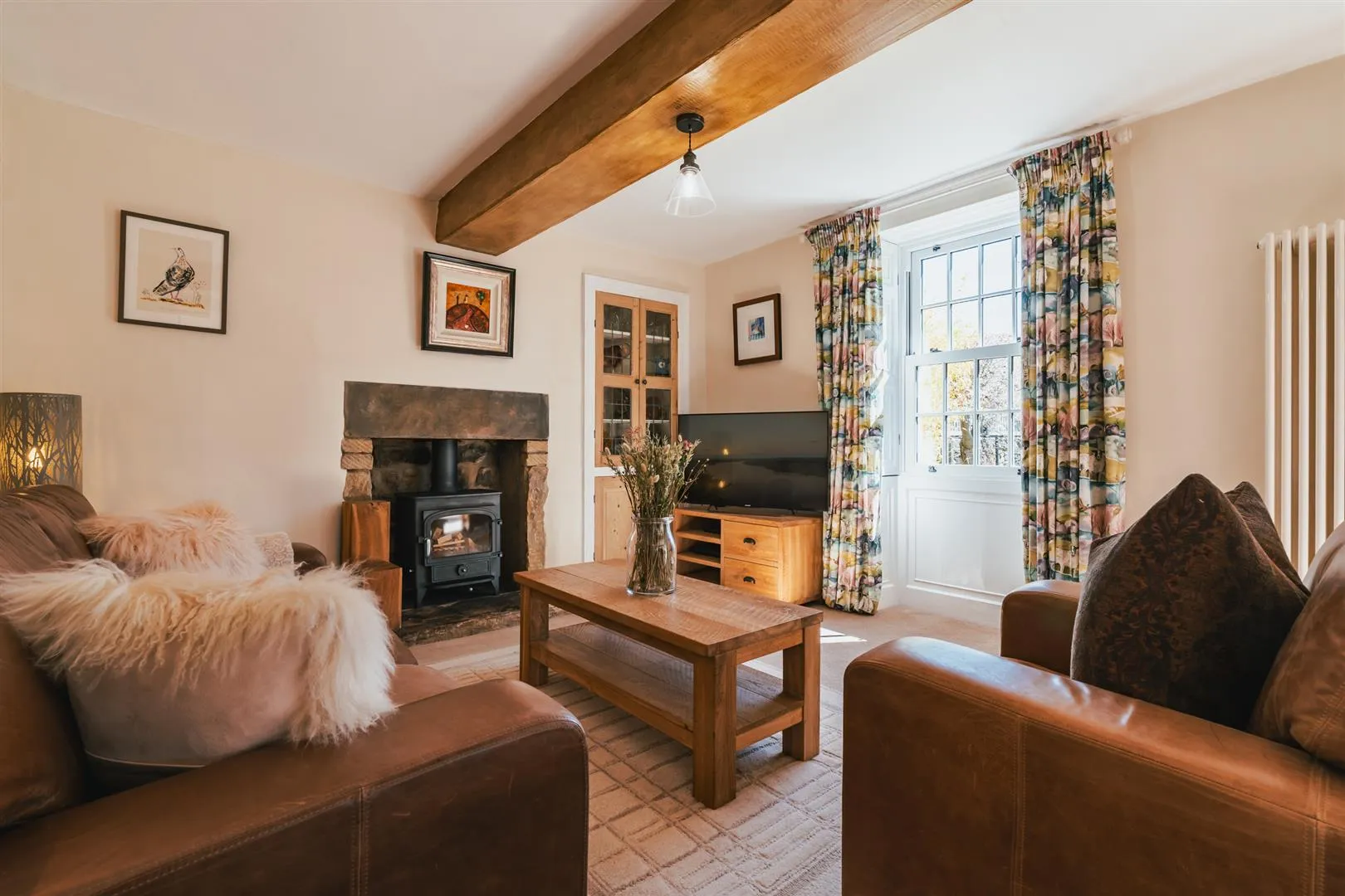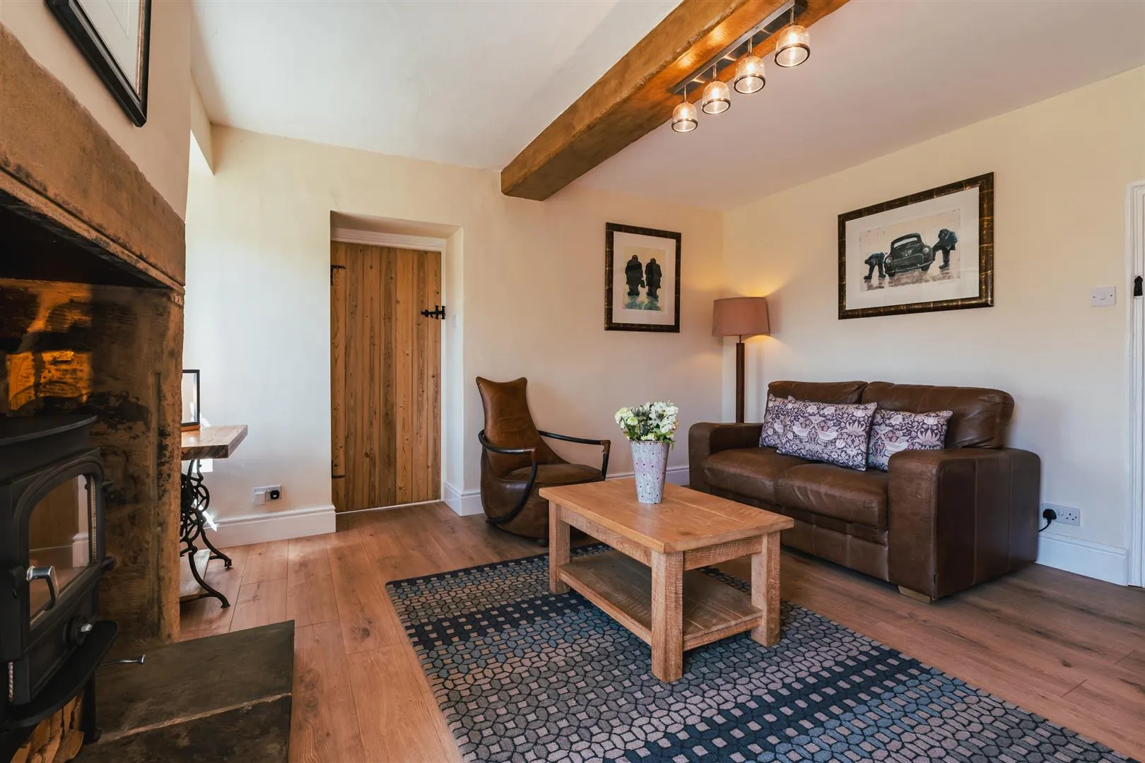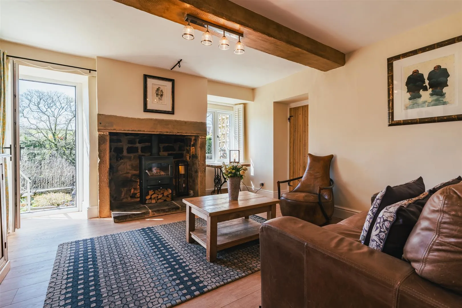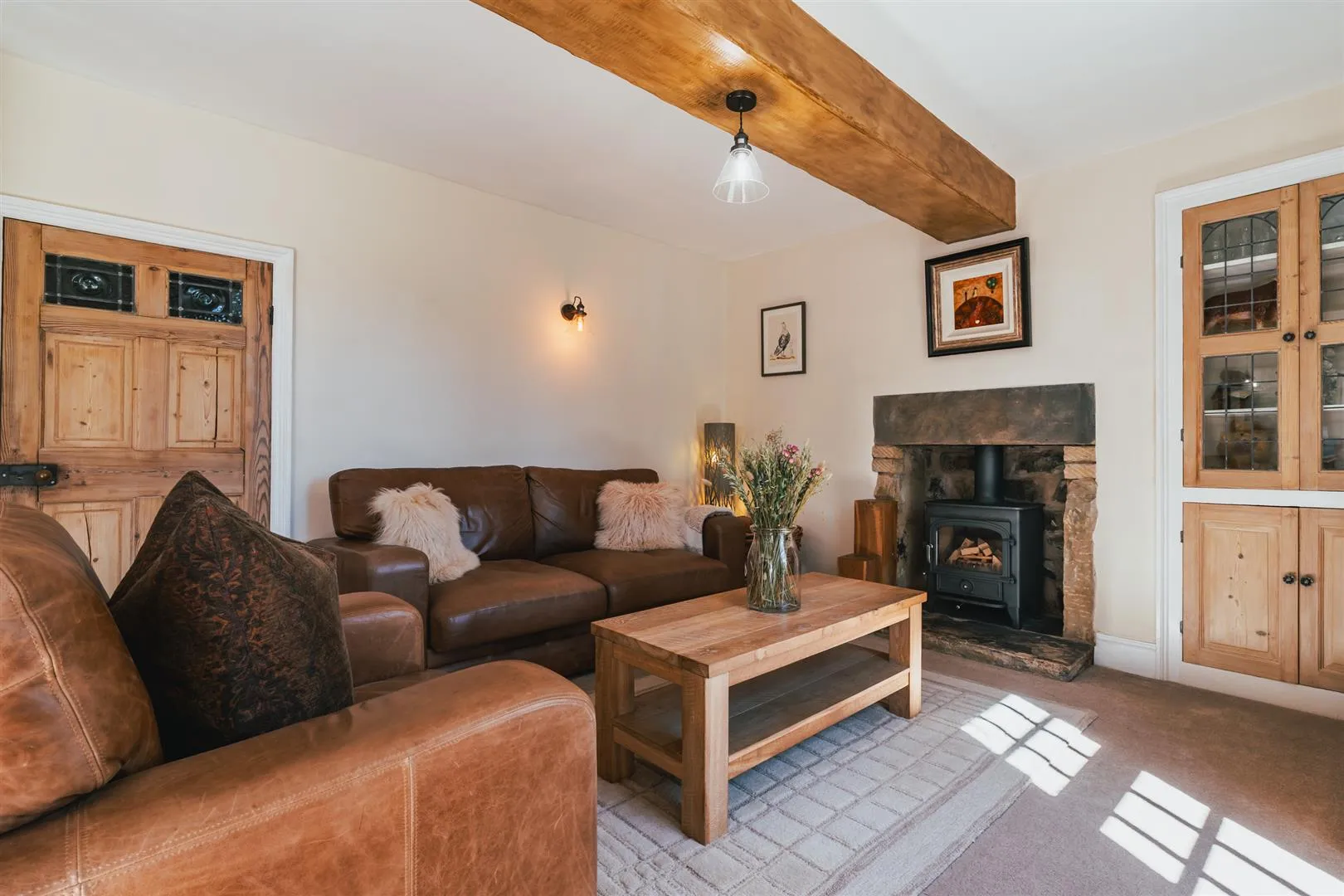 Having a rear facing UPVC double glazed window with shutters, flush light point, exposed timber beam, central heating radiator and timber flooring. The focal point of the room is the log burner with a stone surround and hearth. Timber doors open to the storage cupboard and kitchen. A UPVC door with a double glazed panel opens to the rear of the property.