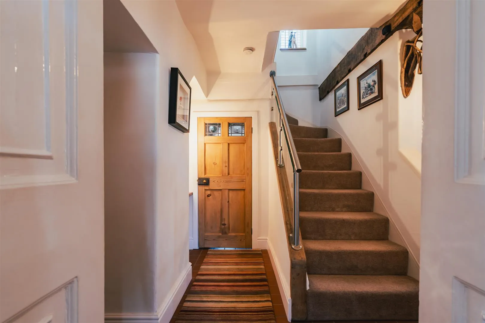From the entrance hallway, a staircase with a steel handrail and glazed balustrading rises to the: