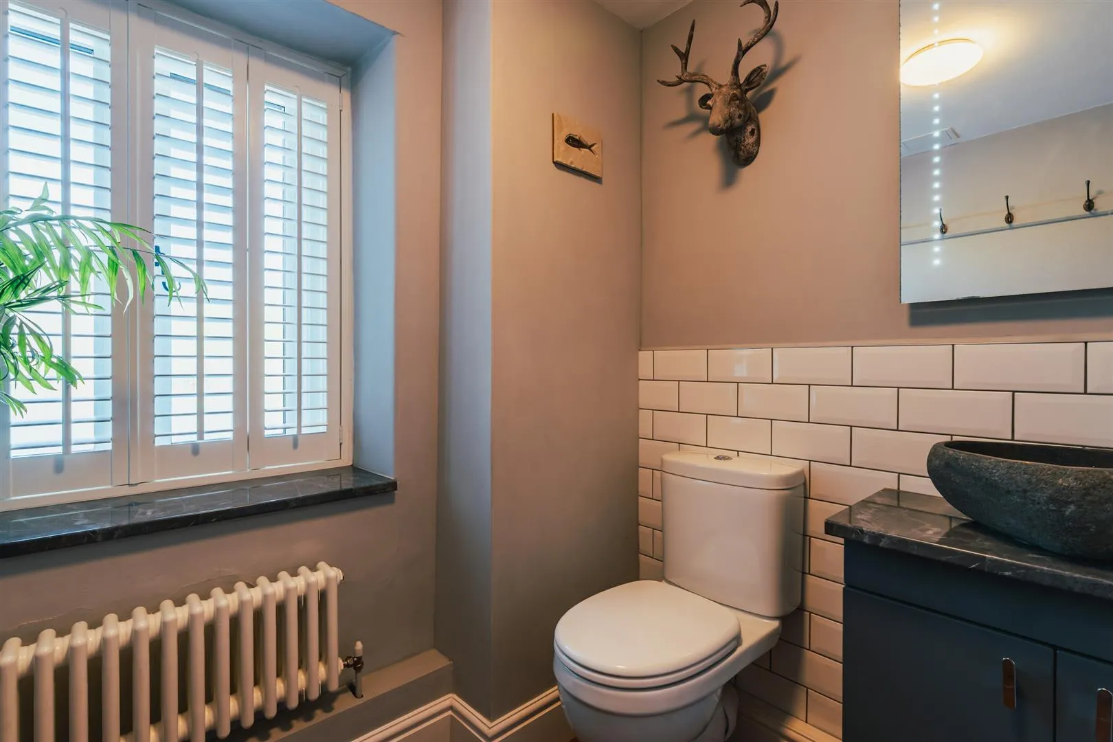 Having a side facing UPVC double glazed obscured window with shutters, flush light point, central heating radiator and tiled flooring. A suite comprises a low-level WC and a wash hand basin with a chrome mixer tap and storage beneath.