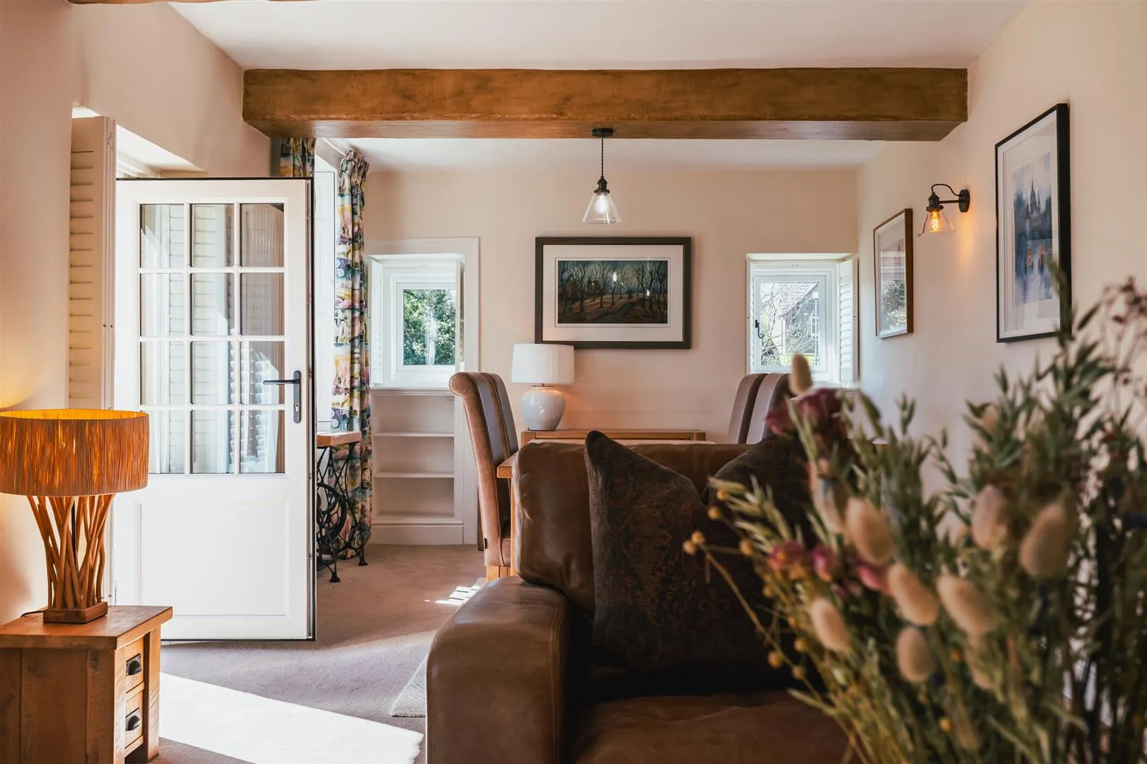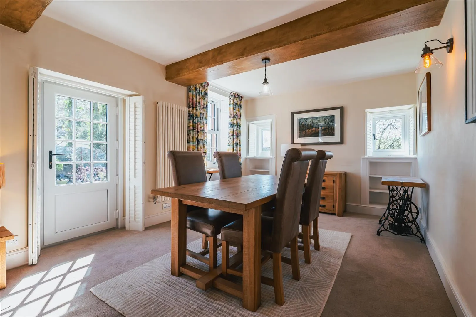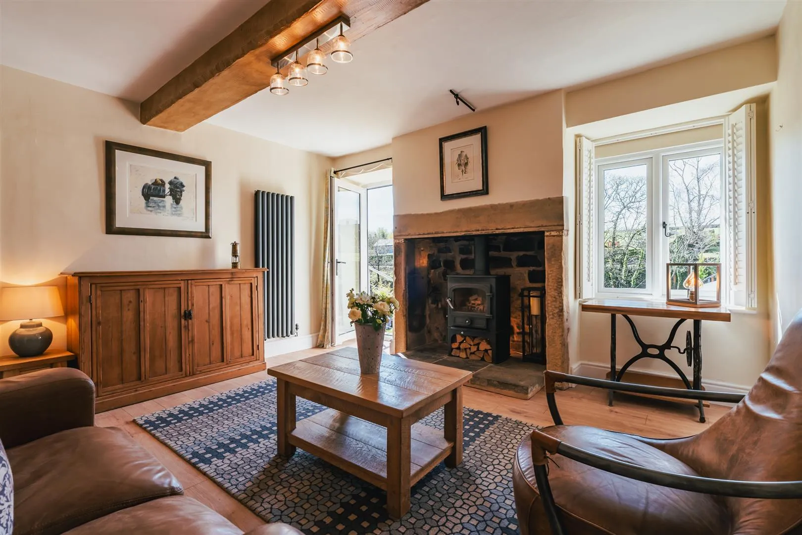 A beautiful lounge/dining room with rear and side facing UPVC double glazed windows with shutters, exposed timber beams, wall mounted light points and central heating radiators. Fitted furniture includes shelving. The focal point of the room is the log burner with a stone surround and hearth. A UPVC door with a double glazed panel opens to the side of the property.