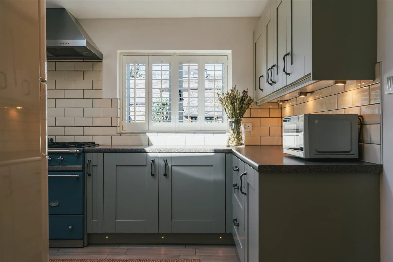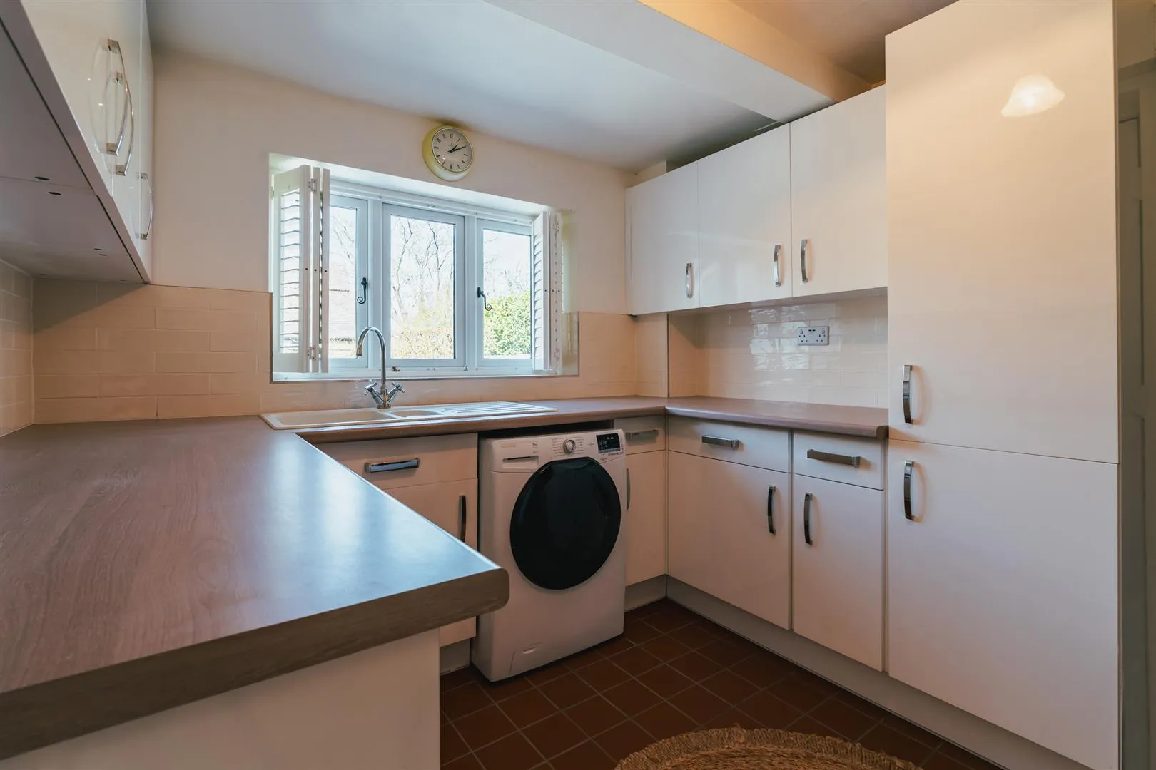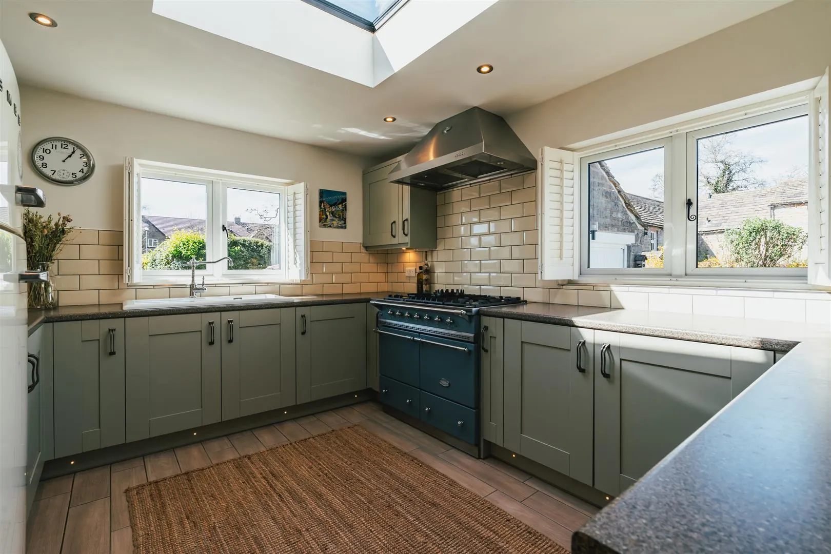 A well-appointed kitchen with rear and side facing UPVC double glazed windows with shutters, triple glazed roof lantern, recessed lighting, central heating radiator and ceramic tiled flooring. A range of fitted base/wall and drawer units incorporate a work surface, tiled splashbacks, under-counter lighting and an inset 1.0 bowl sink with a chrome mixer tap. Appliances include a range cooker and extractor hood. A timber door opens to the utility room.