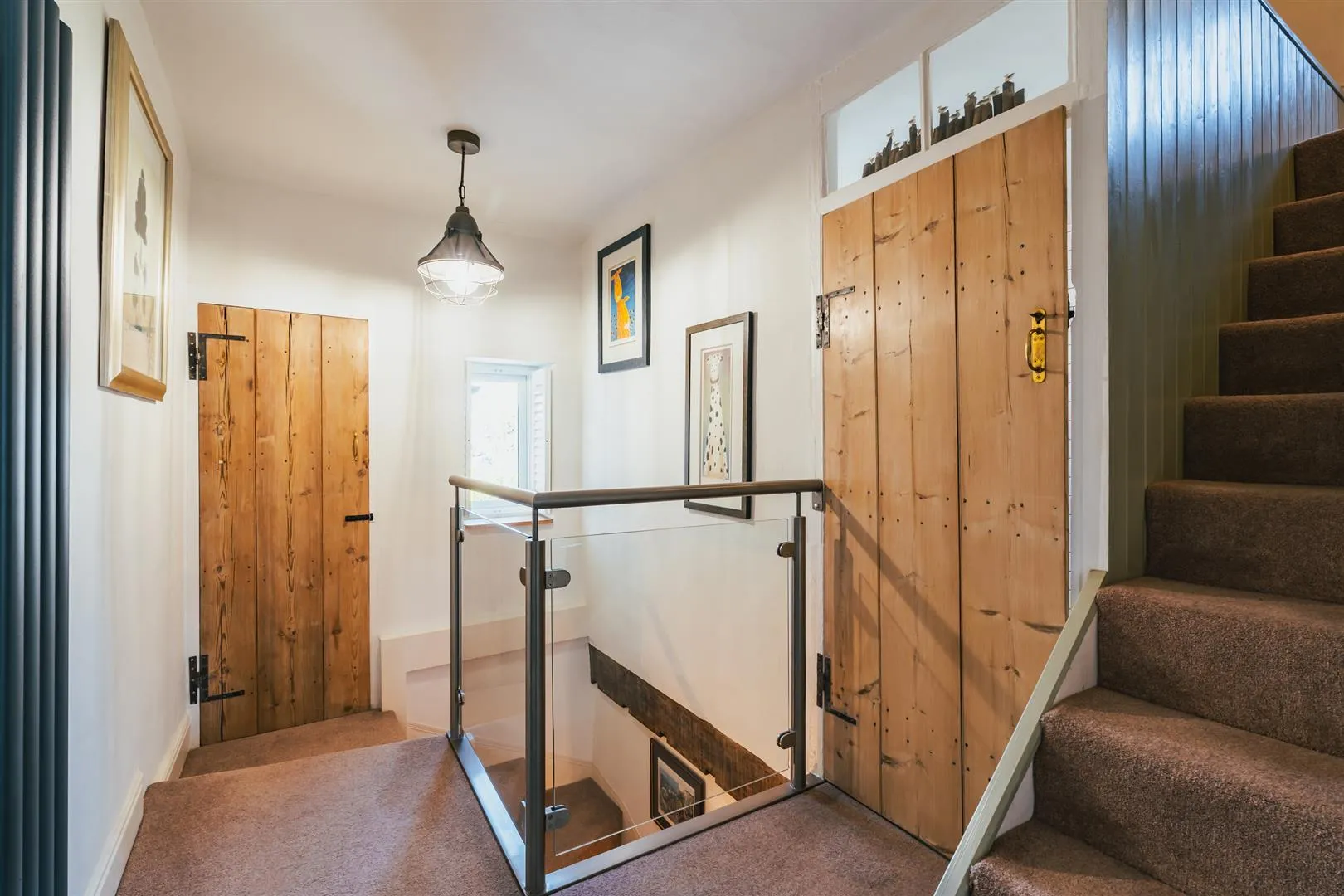 From the landing, a staircase with glazed balustrading rises to the: