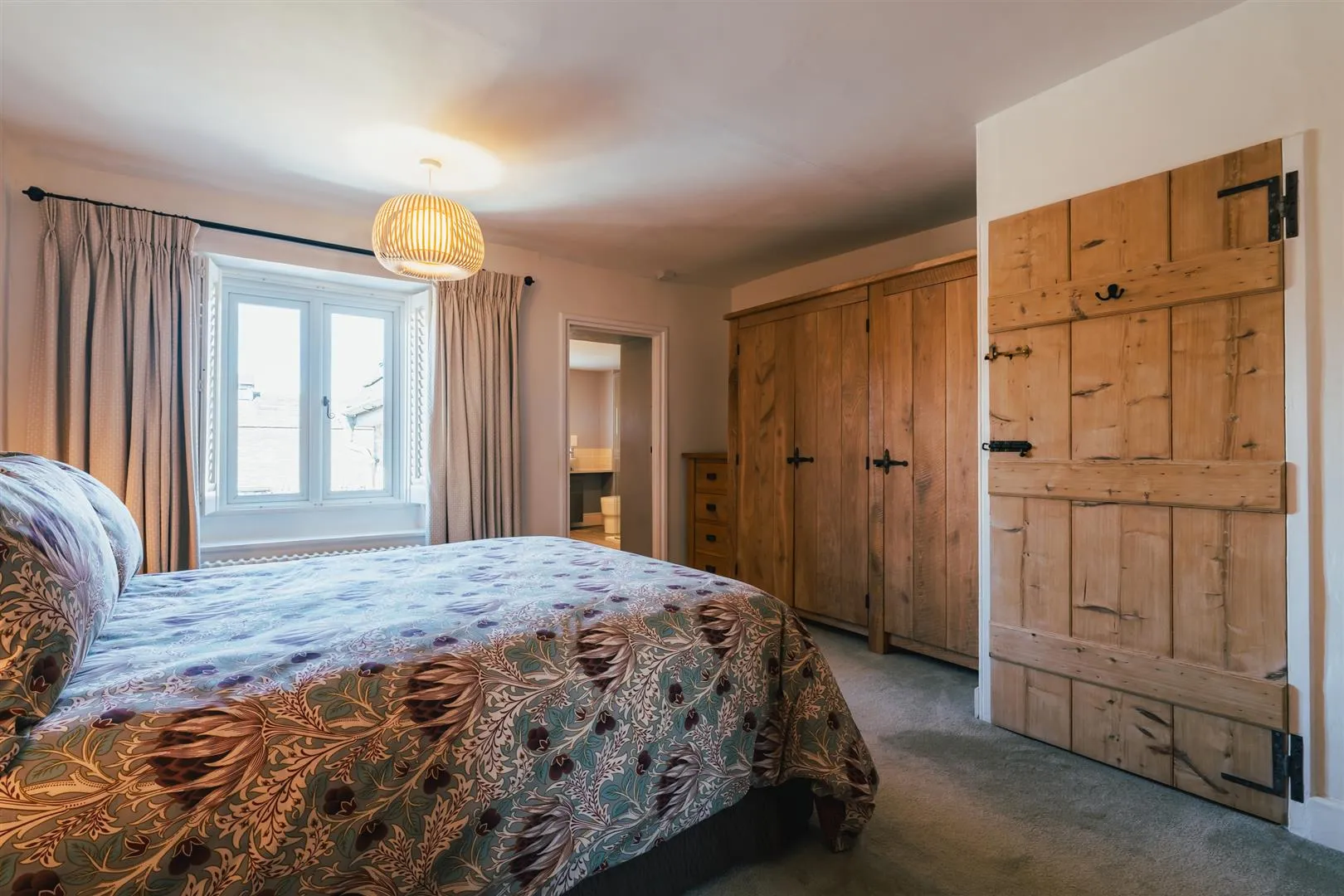 A good-sized master bedroom with a side facing UPVC double glazed window with shutters, pendant light point and a central heating radiator. A timber door opens to the master en-suite bathroom.