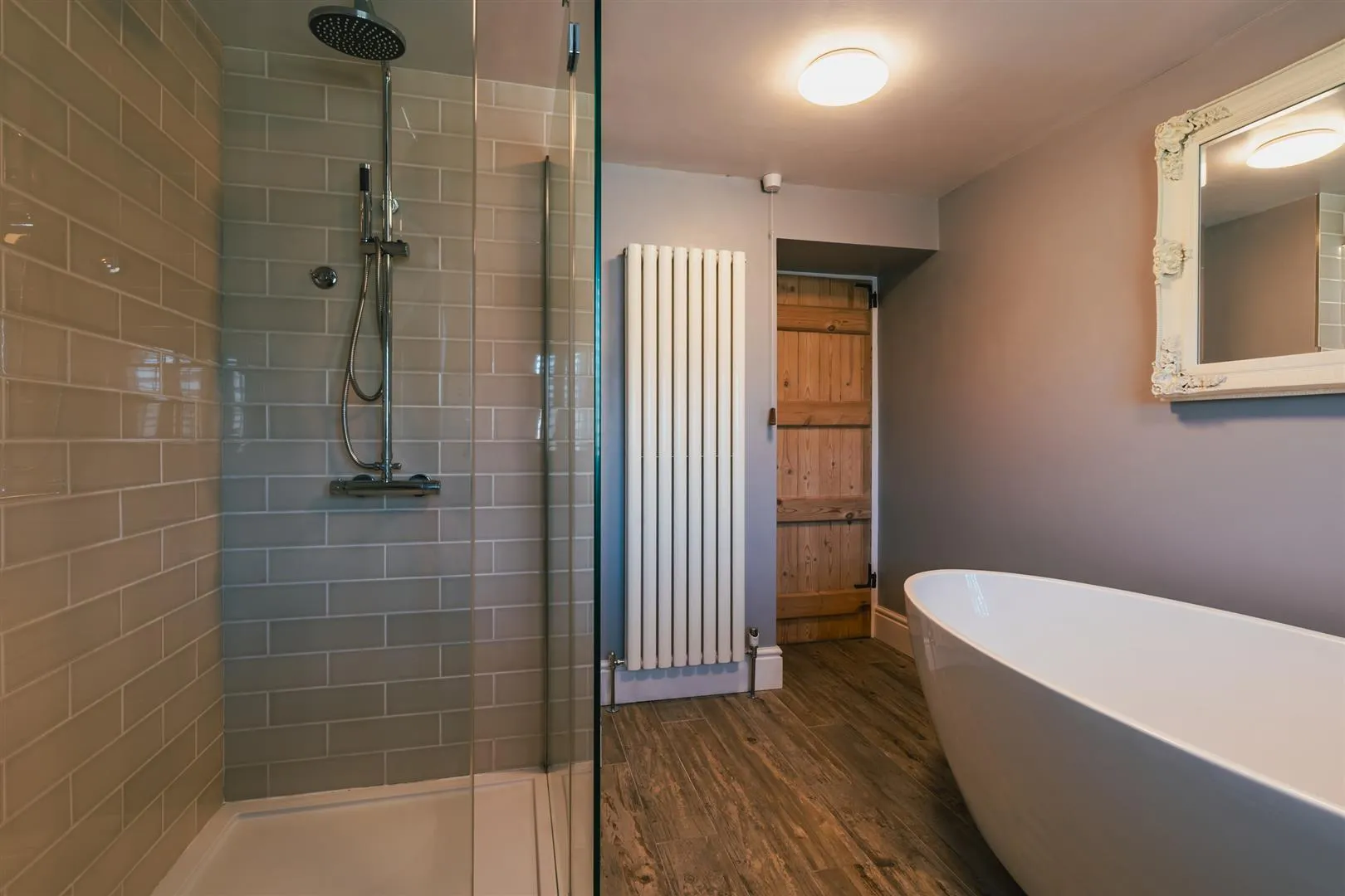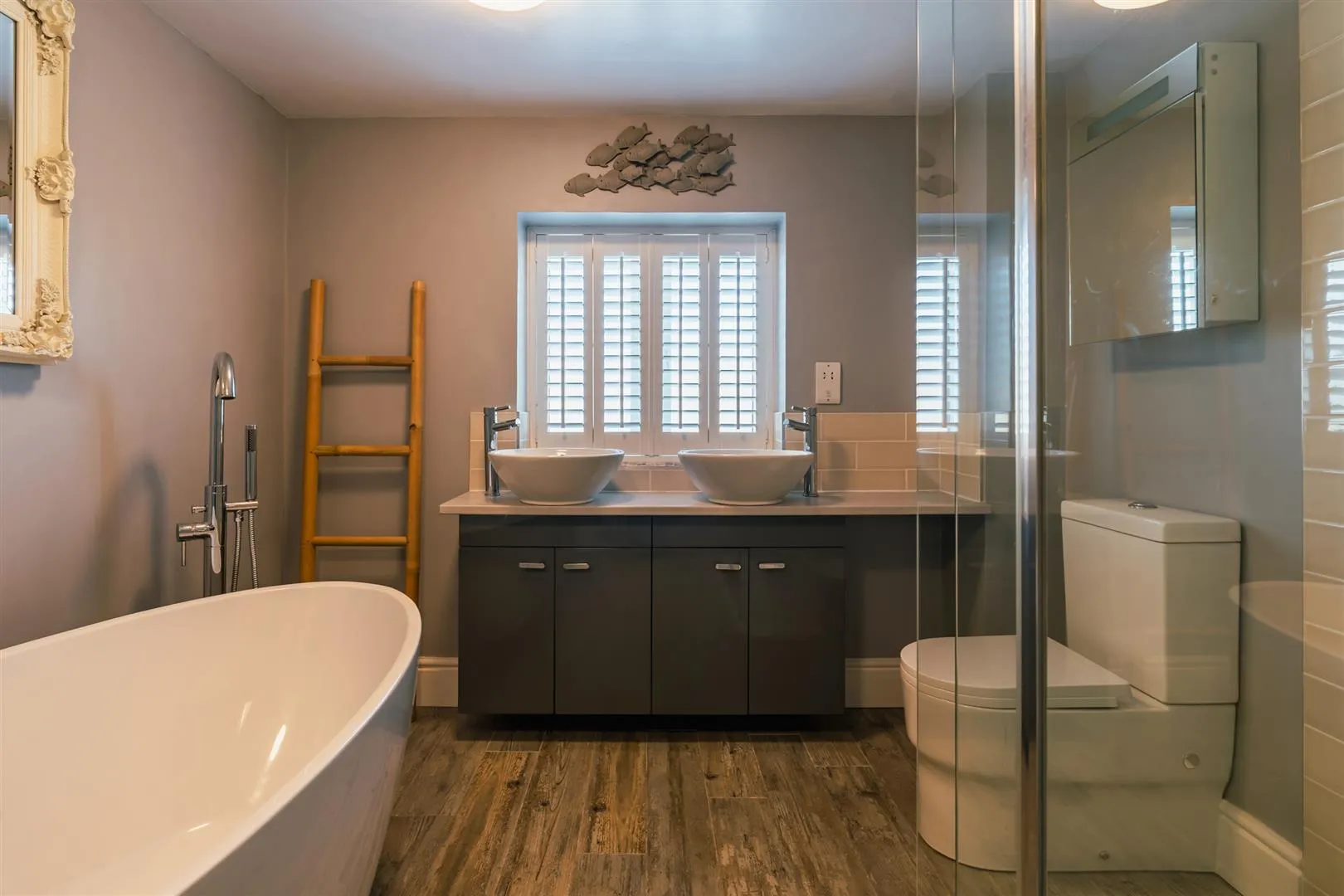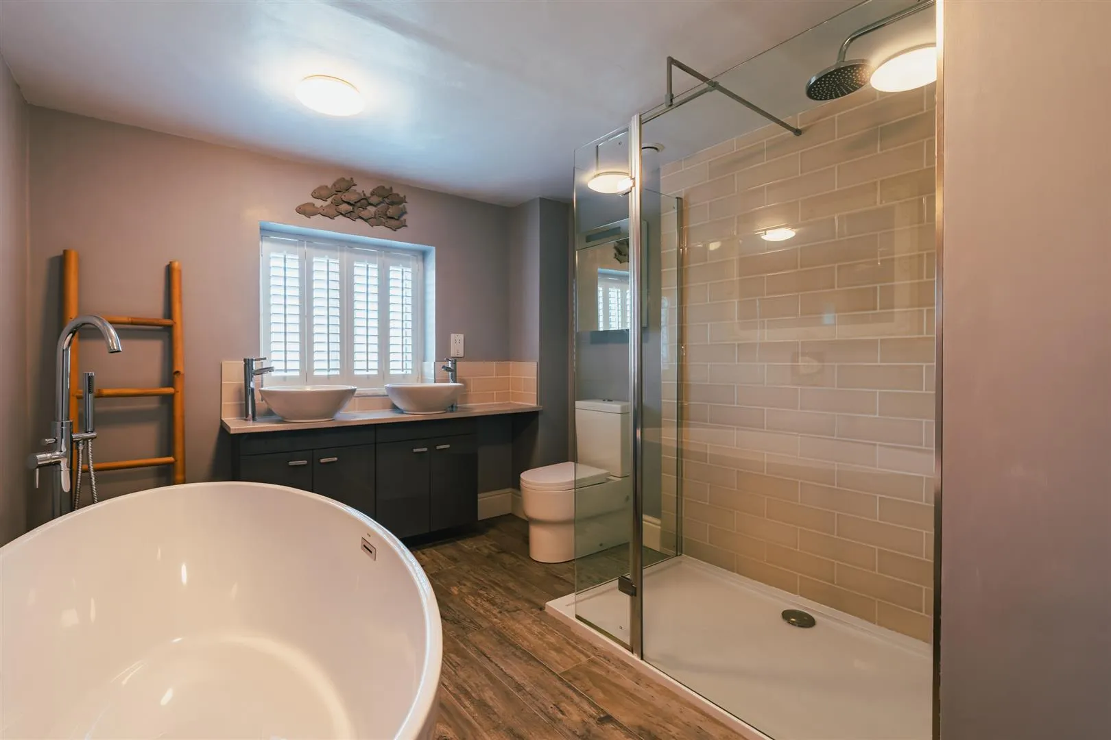 With a side facing UPVC double glazed obscured window with shutters, flush light points, central heating radiator and timber flooring. A suite comprises a low-level WC and two wash hand basins with chrome mixer taps. To one wall is a freestanding bath with a chrome mixer tap and an additional hand shower facility. To the other wall is a separate shower enclosure with a rainhead shower, additional hand shower facility and a glazed screen.