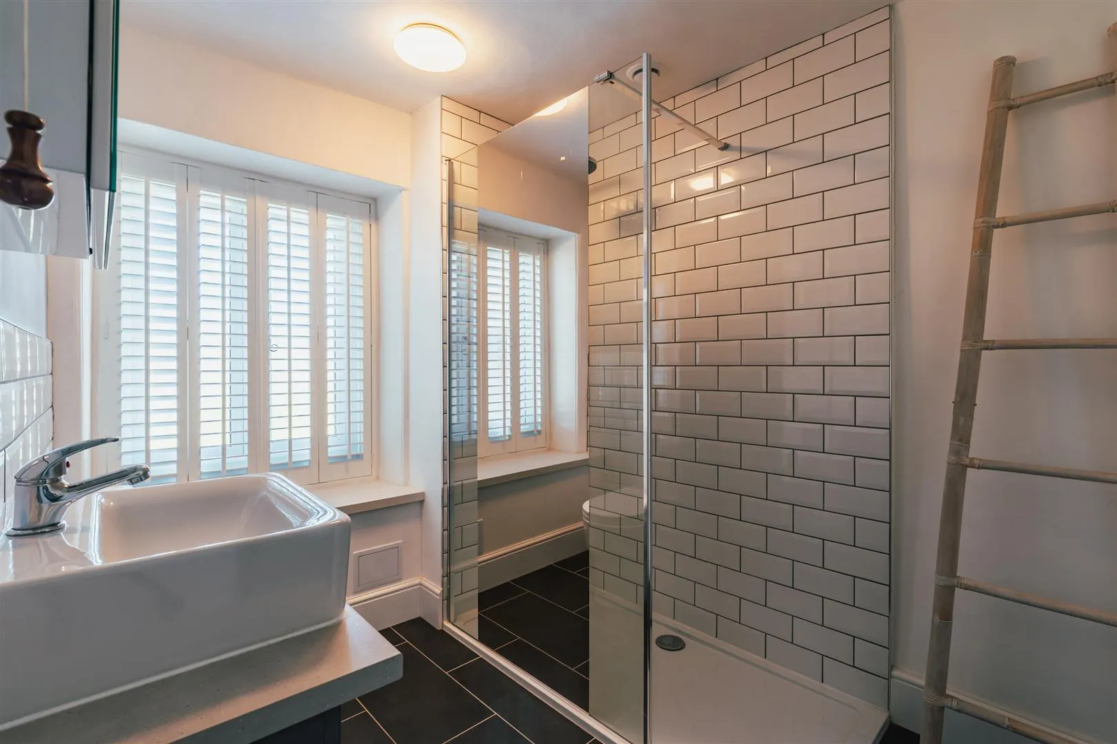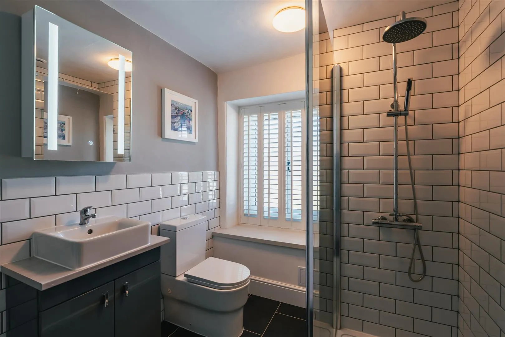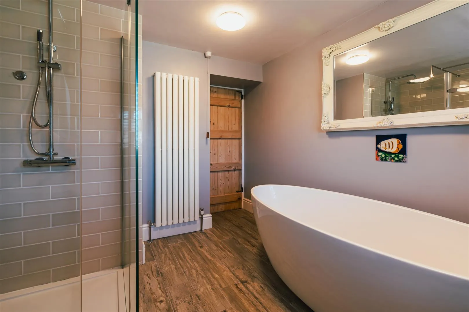 With a side facing UPVC double glazed obscured window with shutters, flush light points, central heating radiator and timber flooring. A suite comprises a low-level WC and two wash hand basins with chrome mixer taps. To one wall is a freestanding bath with a chrome mixer tap and an additional hand shower facility. To the other wall is a separate shower enclosure with a rainhead shower, additional hand shower facility and a glazed screen.