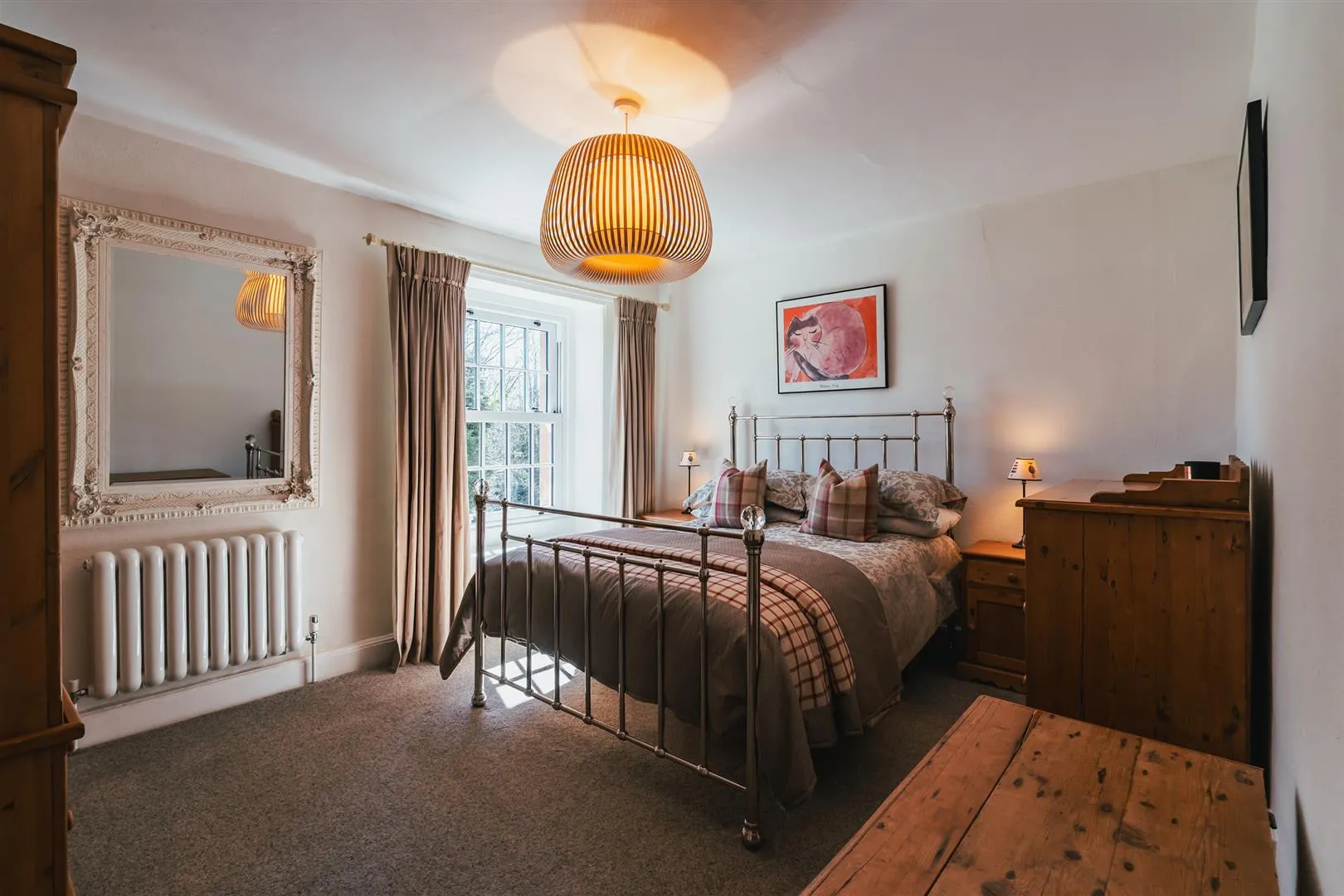 A double bedroom with a side facing UPVC double glazed window, pendant light point and a central heating radiator. Double timber doors open to shelving.