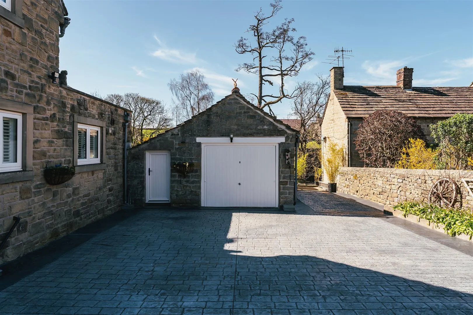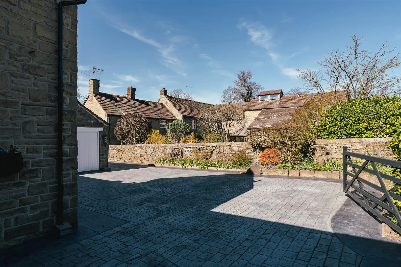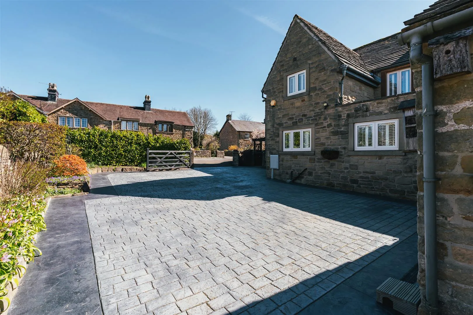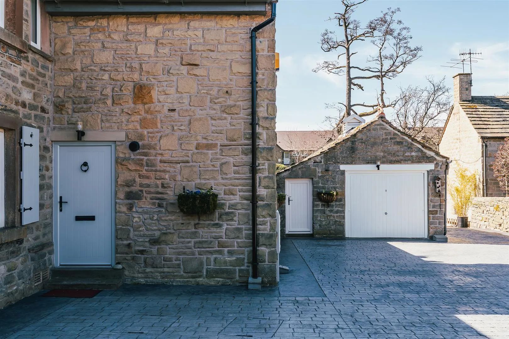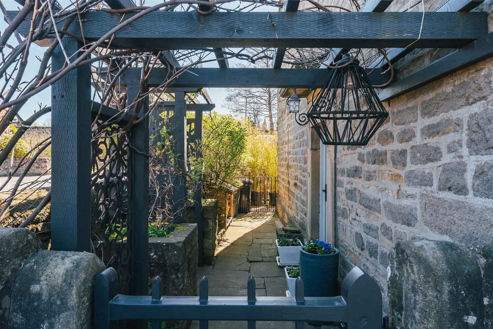 A timber pedestrian gate opens to the front of the property, where access can be gained to the entrance hallway. There is exterior lighting and an array of stone planters.