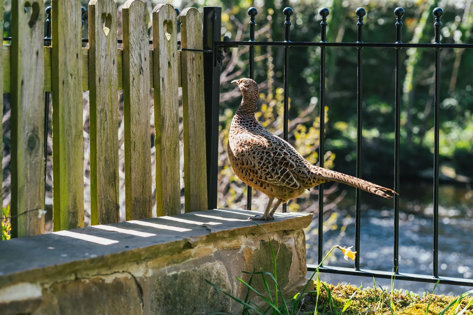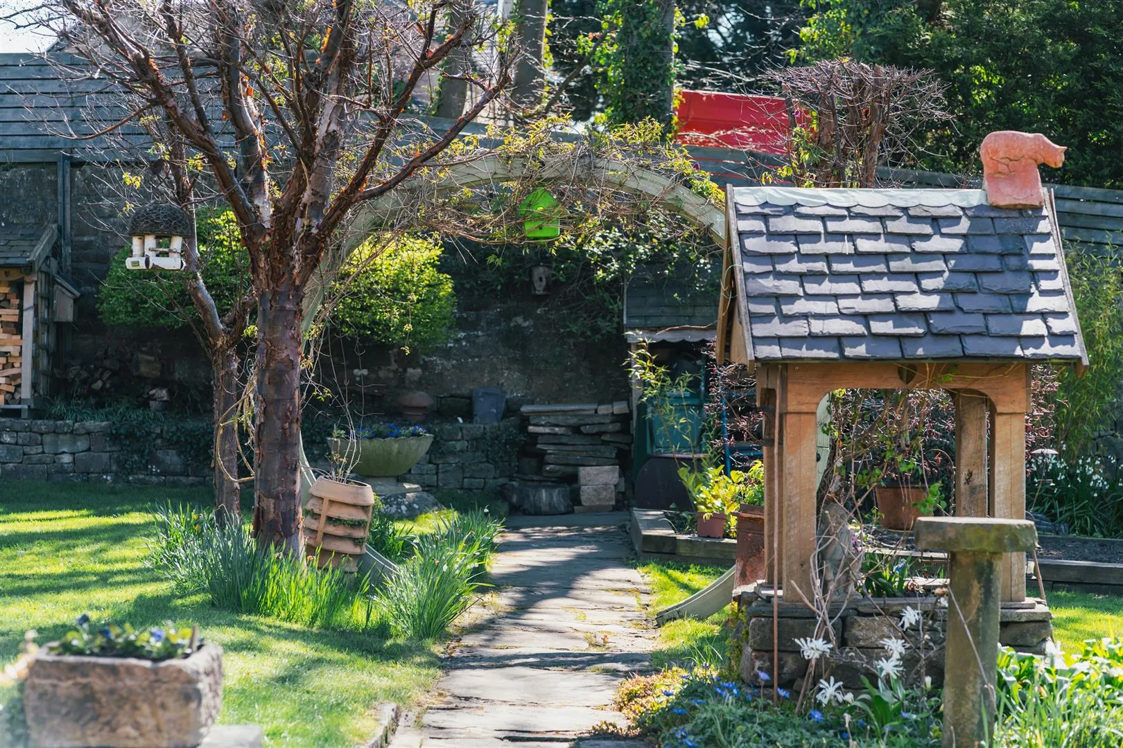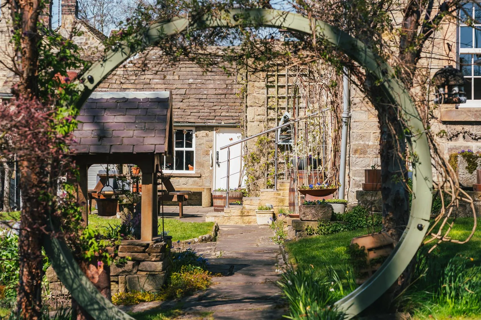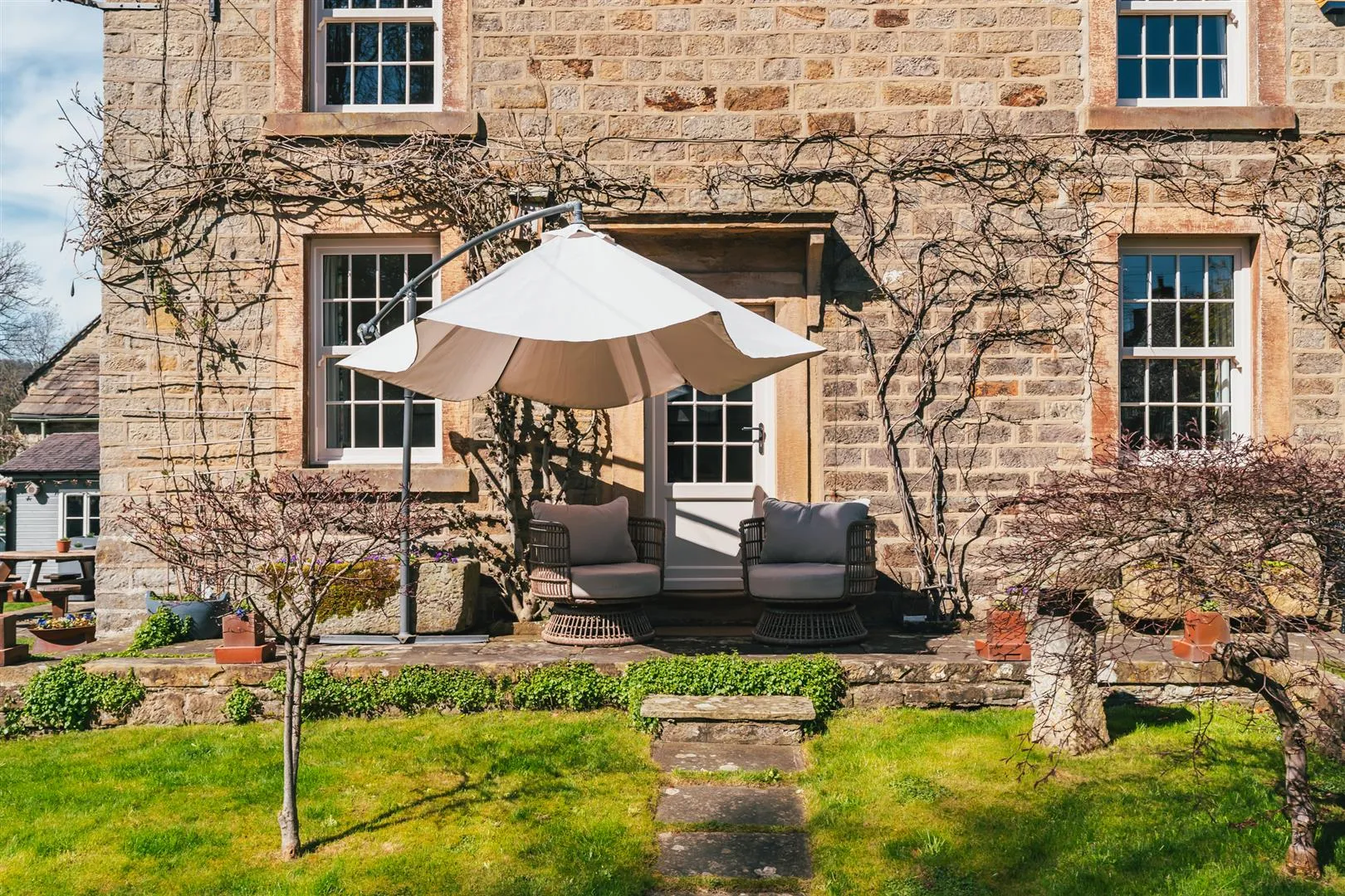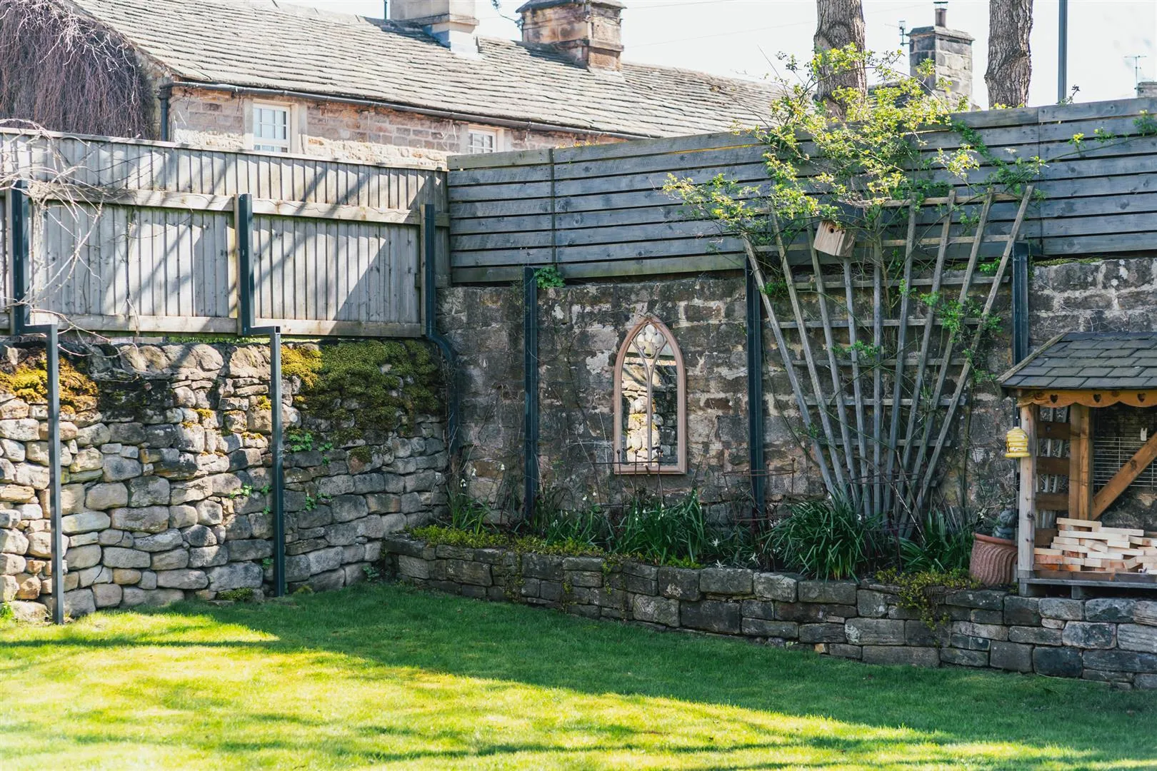 A timber pedestrian gate opens to the front of the property, where access can be gained to the entrance hallway. There is exterior lighting and an array of stone planters.