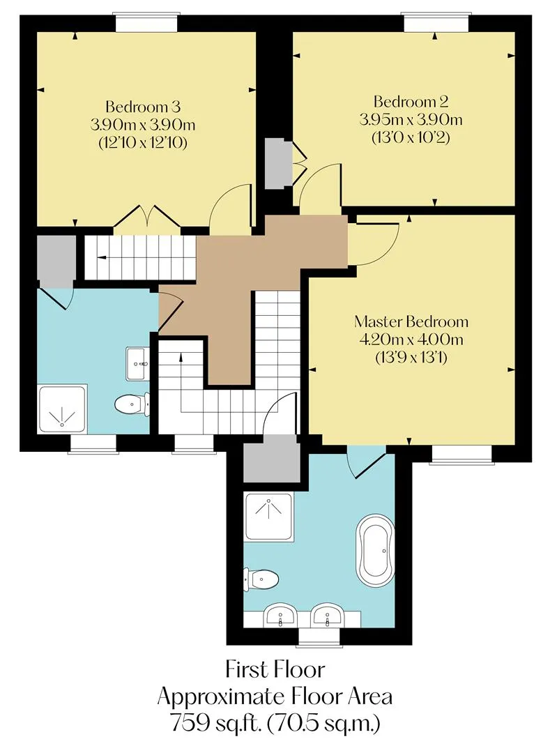 On the first floor: Landing, airing cupbpoard, master bedroom, master en-suite shower room, bedroom 2, bedroom 3, family shower room and storage cupboard.